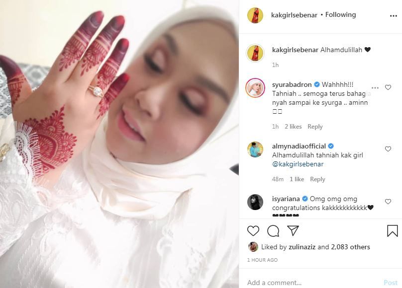 PERSONALITI media sosial Kak Girl menamatkan zaman janda dengan jejaka pilihannya yang dikenali sebagai Osman Ali dengan sekali lafaz pada 9.30 pagi, Rabu. Kak Girl atau nama sebenarnya Nur Amira Maslan, 33, menerusi laman Instagram miliknya meluahkan rasa syukur majlis pernikahannya berjalan dengan lancar. ARTIKEL BERKAITAN: 10 bulan 'single', Kak Girl sudah temui pengganti, bakal nikah September - “Dia crush saya masa zaman sekolah” Dia turut berterima kasih kepada Pejabat Kadi Daerah Johor yang memudahkan urusan perkahwinannya biarpun dalam tempoh Perintah Kawalan Pergerakan Bersyarat (PKPB). Pengantin ramai hari ini tapi proses berjalan dengan lancar. KAK GIRL PERSONALITI MEDIA SOSIAL "Alhamdulillah. Pengantin PKPB... Alhamdulillah semuanya mudah dan lancar. Terima kasih atas kerjasama pihak #pajabatkadidaerahJohor. "Syukur sangat... hubungan ini berakhir dengan ikatan yang sah. Walaupun dalam tempoh PKPB, tapi masih mematuhi SOP yang ditetapkan. "Pengantin ramai hari ini tapi proses berjalan dengan lancar," katanya kepada mStar. Kak Girl berkongsi berita gembira itu dengan memuat naik foto pernikahannya di laman Instagram pada Rabu. Ruang komen di perkongsian tersebut dipenuhi dengan ucapan tahniah daripada netizen termasuklah rakan selebriti. Rakan-rakan selebriti turut mengucapkan tahniah kepada Kak Girl. "Alhamdulillah... tahniah sister. I love you," komen pelakon Zulin Aziz. Manakala pelakon Datin Almy Nadia dan Isya Riana turut meninggalkan komen memberi ucapan tahniah dan syukur atas pernikahan pasangan itu. Sebelum ini, Kak Girl mendedahkan dia mengikat tali pertunangan dengan Osman pada 28 Jun lalu. Menerusi laporan mStar pada 13 Julai lalu, Kak Girl berkata dia mengenali Osman ketika di bangku sekolah dan mengakui pernah menyimpan perasaan terhadap lelaki itu. Sebelum ini, Kak Girl pernah berkahwin dengan Mohd Hafizi Marzuki pada 20 Februari 2015 namun pasangan ini bercerai pada Oktober 2019. Nak macam-macam info? Join grup Telegram mStar!