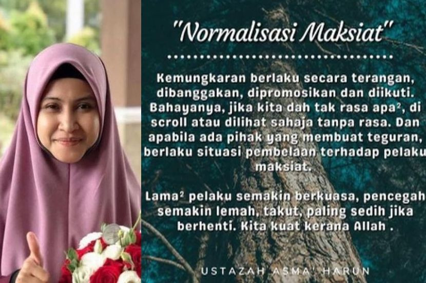 PENDAKWAH bebas terkenal, Ustazah Asma Harun sekali lagi membuat teguran terbuka kepada golongan artis dan selebriti agar lebih bertanggungjawab terhadap masyarakat. Menerusi perkongsian terbaharu di Instagram, Asma mengingatkan para artis supaya tidak menghidangkan persembahan berunsur maksiat, lucah atau yang boleh menjatuhkan maruah. ARTIKEL BERKAITAN: Ustazah Asma Harun tegur MV artis pamer tarian lucah, separuh bogel - “Kalian bangga dengan maksiat? Ini musibah ummah yang parah!” "Mohon duhai semua artis tanah air atas tiket apa pun sama ada pelakon, penyanyi, pelawak, pengacara dan lain-lain. Jadilah penghibur yang ada rasa tanggungjawab, tidak menyumbang kepada kerosakan yang sedia parah ini. "Hentikan persembahan atau pertandingan berunsur maksiat, berunsur lucah dan menjatuhkan maruah. "Diharapkan Kementerian Komunikasi dan Multimedia, pihak berwajib, Persatuan Seniman dan lain-lain turut boleh memainkan peranan dalam isu begini. Jika tidak dibendung dengan bersungguh, maka normalisasi akan berlaku," katanya. Ustazah Asma Harun memuat naik 'surat terbuka' di Instagramnya menasihati golongan selebriti. Asma membuat teguran tersebut kerana menurutnya dunia hiburan pada ketika ini seakan-akan menormalisasikan maksiat dalam sesuatu persembahan yang dilakukan golongan artis. "Kemungkaran berlaku secara terangan, dibanggakan, dipromosikan dan diikuti. Bahayanya jika kita dah tak rasa apa-apa, scroll atau dilihat sahaja tanpa rasa. "Dan apabila ada pihak yang membuat teguran, berlaku situasi pembelaan terhadap pelaku maksiat. "Lama-lama pelaku semakin berkuasa, pencegah semakin lemah, takut, paling sedih jika berhenti. Kita kuat kerana Allah," katanya. Tidak bermaksud untuk 'mencerca' pekerjaan golongan artis, sebaliknya Asma mengakui golongan selebriti diperlukan dalam persada seni bagi memenuhi fitrah manusia yang memerlukan hiburan. Hentikan persembahan atau pertandingan berunsur maksiat, berunsur lucah dan menjatuhkan maruah. USTAZAH ASMA HARUN PENDAKWAH BEBAS Namun dia berharap agar ia tidak dilakukan dengan cara yang boleh melalaikan. "Iya, kalian diperlukan dalam persada seni, memenuhi fitrah insani, namun bukan dengan cara begini. "Kasihanilah diri sendiri, kita semua bakal mati, janganlah ditangguh lagi hajat untuk kembali," ujarnya lagi. Dalam entri tersebut, pelakon Syatilla Melvin dan Noor Khiriah turut dilihat meninggalkan komen di atas kata-kata 'peringatan' yang dikongsikan oleh Asma. Syatilla Melvin berterima kasih di atas teguran Ustazah Asma Harun. "Terima kasih atas ingatan ustazah. Sejujurnya saya terasa sesuatu apabila baca apa yang ustazah tulis sebab saya pernah berada di fasa berbuat salah. "Alhamdulillah dan terima kasih sekali lagi atas ingatan untuk terus ke jalan kebaikan," tulis Syatilla. "Terima kasih atas ingatan ustazah," ungkap pelakon Noor Khiriah. Menerusi laporan mStar terdahulu, Asma melahirkan rasa terkejut apabila menonton video muzik lagu Ayda Jebat berjudul Parah yang dikatakan secara terang-terangan mempamerkan aksi lucah dan memalukan. Nak macam-macam info? Join grup Telegram mStar! TONTON VIDEO PILIHAN!
