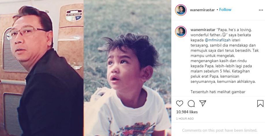 SUAMI kepada pelakon Mira Filzah, Wan Emir meluahkan kerinduan terhadap Allahyarham bapanya iaitu Datuk Wan Mohammad Khair-il Anuar yang genap lima tahun meninggalkan mereka sekeluarga. Emir atau nama sebenarnya Wan Emir Astar Wan Mohammad Khair-il Anuar berkata, dalam kepiluan itu, dia dipujuk isteri tersayang agar tidak terus dibelengu dengan perasaan sedih. ARTIKEL BERKAITAN: [VIDEO] Siapa bakal suami Mira Filzah? Kenali Wan Emir Astar, jejaka hitam manis berkumis nipis ARTIKEL BERKAITAN: Ramadan pertama sebagai isteri, Mira Filzah tak banyak masa berbuka dengan suami... jadual padat sampai Syawal "Papa, seorang yang penyayang dan ayah yang terbaik... saya berkata kepada isteri tersayang, sambil dia mendakap dan memujuk saya dari terus bersedih. Emir berkongsi luahannya di Instagram. "Tak mampu untuk mengelak, mengenangkan kasih dan rindu kepada papa, lebih-lebih lagi pada malam sebelum 5 Mei. Ketagihan peluk erat papa, kemanisan senyumannya dan kemurnian akhlaknya. "Tersentuh hati melihat gambar sewaktu saya kecil, yang baru sahaja bangun daripada tidur, tidak lari reaksi daripada mengikut reaksi papa sewaktu dia bangun tidur. "Seolah-olah jiwa diri ini dari kecil lagi, sudah terikut jejak langkah jiwa yang akan dirindui," luah Wan Emir. Wan Emir turut berkongsi gabungan foto reaksi wajah dia ketika kecil dan arwah bapanya yang seakan-akan sama di laman Instagram miliknya pada Rabu. Ketagihan peluk erat papa, kemanisan senyumannya dan kemurnian akhlaknya. WAN EMIR SUAMI MIRA FILZAH Untuk rekod, arwah bapa Emir iaitu Wan Mohammad Khair-il Anuar meninggal dunia dalam nahas helikopter di Sarawak pada 5 Mei 2016 dan berita pemergiaan arwah mendapat liputan yang meluas. Dalam pada itu, Wan Emir yang bekerja sebagai seorang arikitek mengakui dia sekeluarga masih terkesan dengan pemergian Allahyarham biarpun sudah lima tahun berlalu. [Sertai fan club Telegram mStar Rojer. Kita boleh borak-borak DI SINI] Bagaimanapun, Wan Emir bersyukur kerana masih diberikan nikmat sebagai seorang muslim dan berpegang kepada doa serta amalan yang dijadikan hadiah untuk arwah bapanya. Foto kenangan Emir bersama arwah bapanya. "Lima tahun sudah pemergian papa. Di sebalik senyuman kami sekeluarga, ada rindu dan kesedihan yang tak dapat diubati, kerana kesan kasihnya kepada kami terlalu besar. "Syukur diberikan nikmat Islam dan Iman, kerana itulah kami berpegang kepada doa dan amalan sebagai hadiah dan pengganti untuk papa. Dan kami selamanya bersyukur kepada-Nya atas Papa sebagai pinjaman yang sempurna ini kepada kami. "Allahumagh firlahu warhamhu wa'aafihi wa'fu anhu. Jaga dia untuk kami, Ya Rabb. Emir sayang papa... tak terkata," kata Wan Emir. Nak tengok ke posting kelakar dan macam-macam komen? Follow kami di Instagram! TONTON VIDEO PILIHAN!