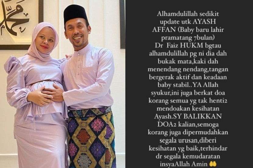 "Alhamdulilah sedikit update utuk Ayash Affan, Dr Faiz HUKM beritahu pagi ini dia dah buka mata, kaki dah menendang-nendang, tangan bergerak aktif dan keadaan baby stabil.