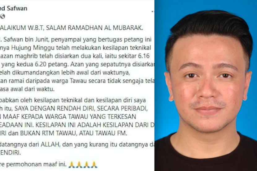 PENYAMPAI radio Tawau FM, Mohd Safwan Junit membuat permohonan maaf terbuka susulan kesilapannya menyiarkan azan maghrib empat minit lebih awal. Mohd Safwan menerusi laman Facebook menjelaskan bahawa berlaku kesilapan teknikal apabila azan maghrib disiarkan dua kali iaitu pada 6.16 petang dan 6.20 petang Ahad. ARTIKEL BERKAITAN: Azan Maghrib 3 minit awal, masjid di Gombak mohon maaf... puasa jemaah terbatal - Nazir "Saya, Mohd Safwan bin Junit, penyampai yang bertugas petang ini dalam Syoknya Hujung Minggu telah melakukan kesilapan teknikal yang mana azan maghrib telah disiarkan dua kali, iaitu sekitar 6.16 petang dan yang kedua 6.20 petang. "Azan yang sepatutnya disiarkan pada 6.20 telah dikumandangkan lebih awal dari waktunya, menyebabkan ramai daripada warga Tawau secara tidak sengaja telah berbuka puasa awal dari waktu," katanya. Dia menegaskan perkara yang berlaku itu disebabkan kesilapan teknikal dan dirinya sendiri. Oleh itu, Mohd Safwan memohon maaf secara peribadi kepada warga Tawau yang terkesan dengan situasi tersebut. "Kesilapan ini, adalah kesilapan dari diri saya sendiri dan bukan RTM Tawau atau Tawau FM. "Yang baik datangnya dari Allah dan yang kurang itu datangnya dari kelemahan diri saya sendiri. Mohon 'share' permohonan maaf ini," ujarnya. Dapatkan info dengan mudah dan pantas! Join grup Telegram mStar DI SINI