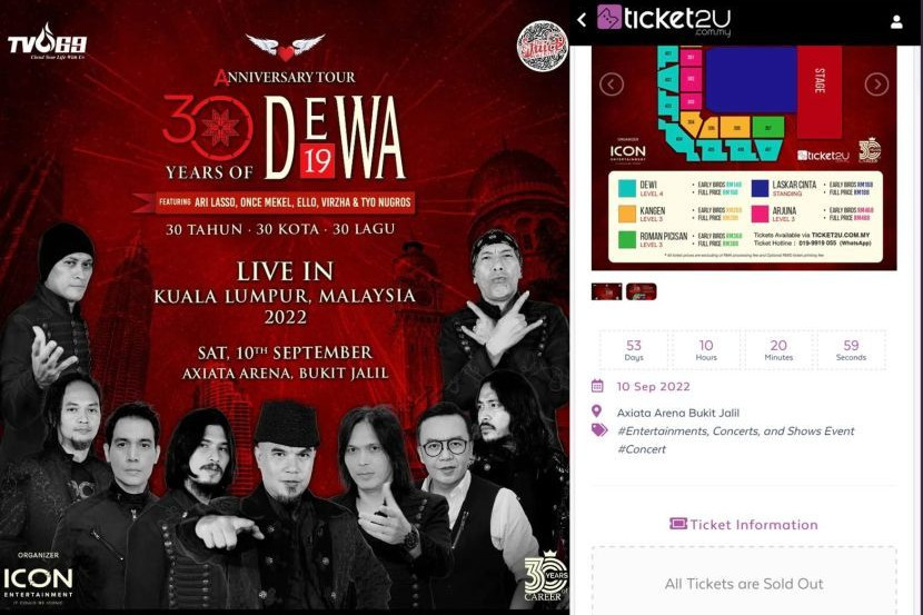 TIDAK sampai sejam, tiket Konsert Anniversary Tour 30 Years of Dewa 19 di Kuala Lumpur habis terjual sehingga membuatkan ramai peminat melahirkan rasa kecewa tidak dapat membuat tempahan.
