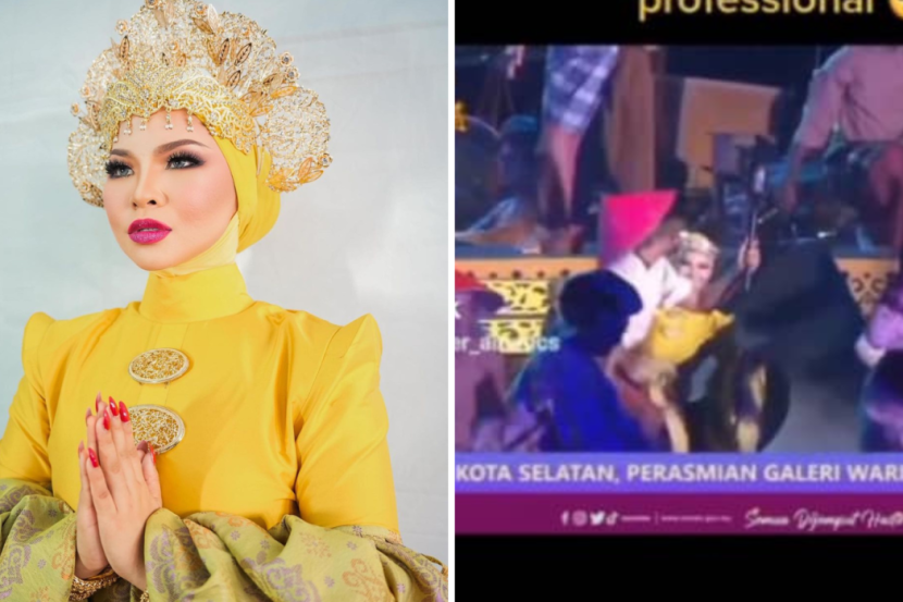 Dua penari pengiring membantu Aina yang jatuh selepas menuruni beberapa anak tangga ketika membuat persembahan.
