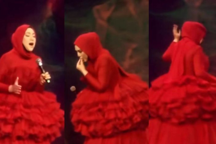 Ketika itu, Shila yang memakai busana merah sedang asyik menyampaikan lagu berjudul Khilaf Asmara.