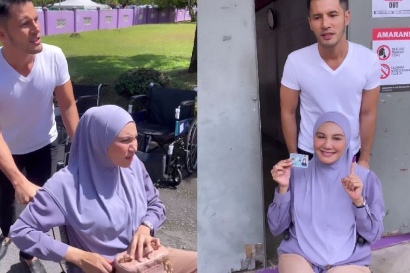 Shahida, 37, dilihat berkerusi roda sambil ditolak oleh suami, Datuk Seri Aliff Syukri ketika hadir di salah sebuah pusat pembuangan undi di Selangor pada Sabtu.