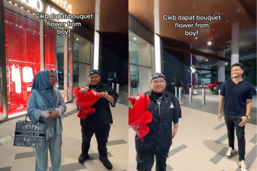 Cik B turut dilihat tersipu malu ketika menerima jambangan bunga berkenaan yang diserahkan sendiri lelaki tersebut di hadapan ibunya.
