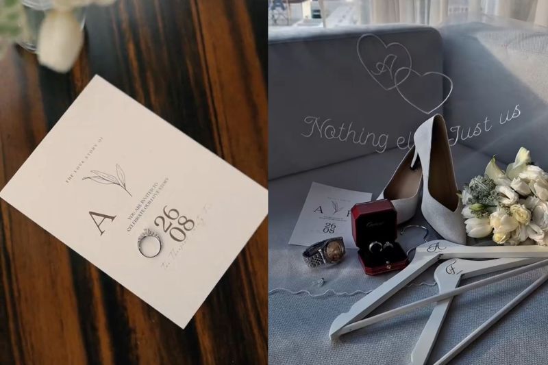 Malah, turut kelihatan cincin emas bersama beberapa dulang hantaran dan kad yang tertera bertarikh 26.08 dengan inisial huruf A.