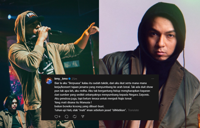 PENYANYI rap, Kmy Kmo meluahkan pendirian tegasnya untuk tidak terlibat dengan sebarang acara atau kerjasama yang ditaja oleh syarikat yang didakwa mempunyai kaitan dengan rejim Zionis Israel.