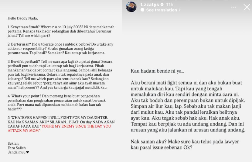 “Kau nak saman aku? Silakan… buat! Pada satu hari nanti, Nada akan cakap pada kau 'You’re my enemy since the day you attack my mom'," ujarnya