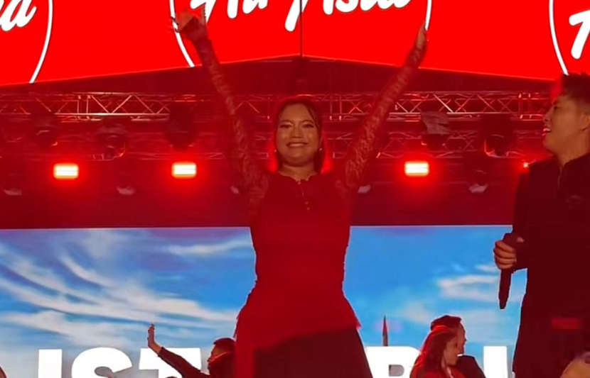 Leona ketika di atas pentas menari bersama krew kabin AirAsia.