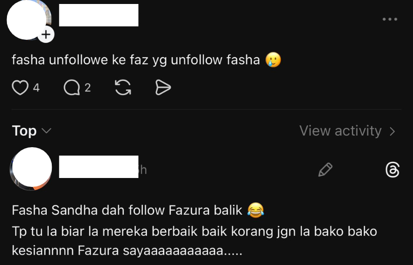 Perkara itu disedari seorang pemilik akaun di aplikasi Threads yang membuat luahan tersebut dan mendakwa Fasha baru sahaja mengikuti semula akaun Instagram sahabat baiknya itu.