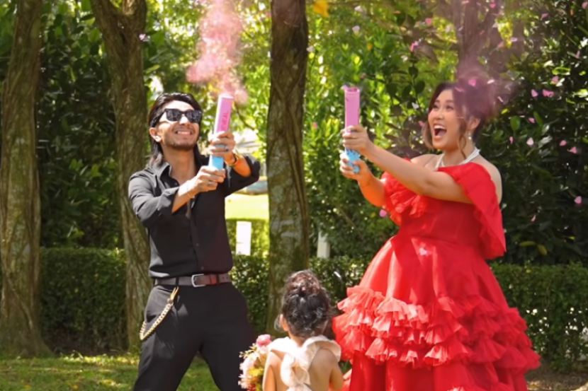 Tasha atau nama sebenarnya Nur Natasha Awi mendedahkan jantina bayi mereka dengan cara meletupkan silinder asap berwarna merah jambu menandakan bakal hadirnya seorang lagi puteri dalam keluarga mereka.