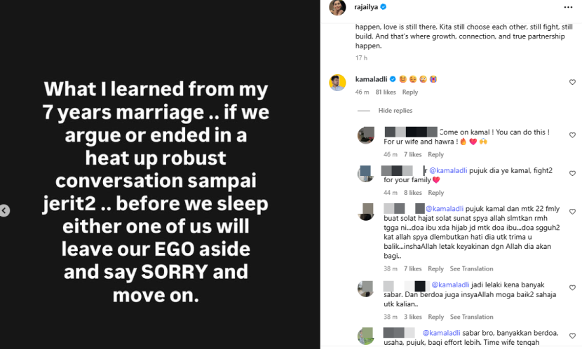 "Kalau boleh selamatkan perkahwinan ini. Kamal kan selalu ada bila dia perlukan. Dalam hal ini sama-sama kena tolong dan faham. Peluklah dia dan dengar apa yang dia nak luahkan," komen netizen.