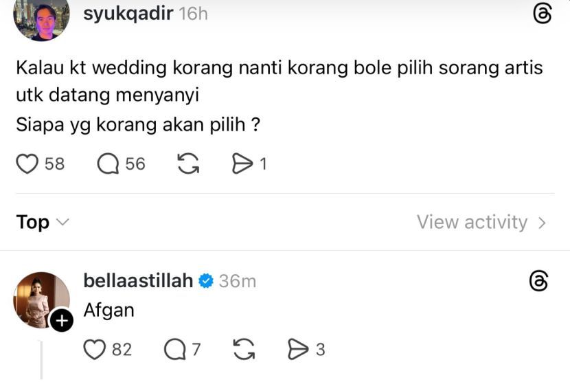 Perkara itu dikongsikan Bella dalam satu hantaran yang dimuat naik seorang pengguna Threads yang bertanya siapa gerangan selebriti pilihan akan diundang untuk membuat persembahan pada majlis tersebut.