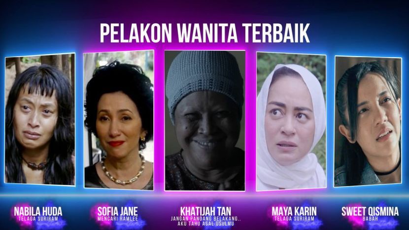 Kategori Pelakon Wanita Terbaik turut menyaksikan pertarungan sengit antara nama besar dan generasi baharu iaitu Nabila Huda (Telaga Suriram), Datin Sofia Jane (Mencari Ramlee), Sweet Qismina (Babah), Khatijah Tan (Jangan Pandang Belakang, Aku Tahu Asal Usul Mu) dan Maya Karin (Telaga Suriram).