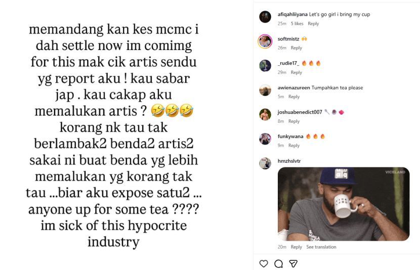 "Biar aku dedah satu-satu, sesiapa perlu sedikit pendedahan? Aku muak dengan industri penuh hipokrit ini!," ujarnya.