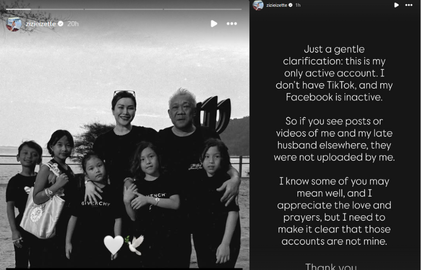 "Jadi jika anda terlihat hantaran atau video tentang saya dan arwah suami di tempat lain, ia bukan dimuat naik oleh saya,” katanya.