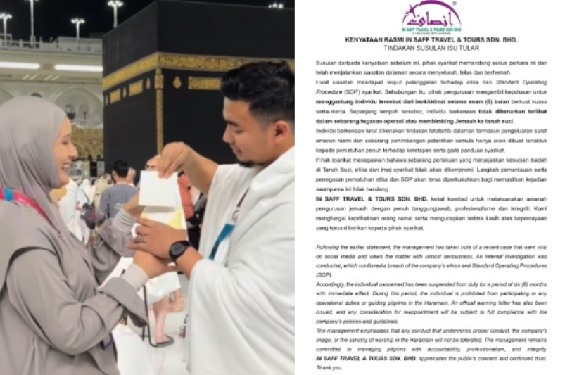 Agensi umrah yang diwakili Hafizi, In Saff Travel & Tours Sdn. Bhd., memaklumkan tindakan tersebut diambil selepas siasatan dalaman dijalankan berhubung isu berkenaan.