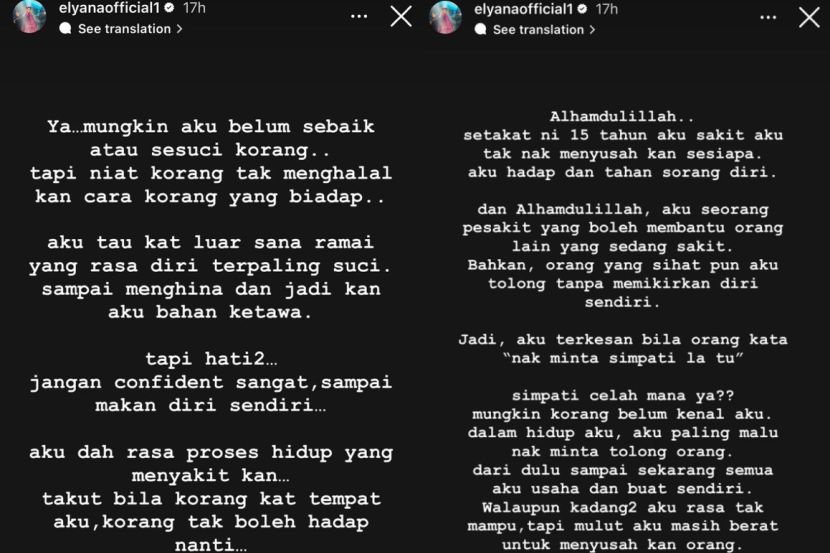 Elyana dalam masa sama memberitahu perkongsian tentang penyakit kanser yang dihidapinya bukanlah bertujuan untuk meraih simpati ramai.