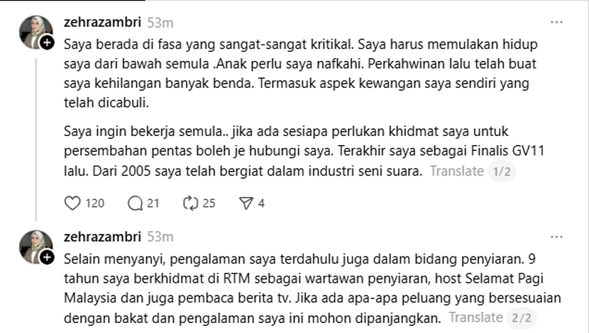 Sebelum itu, Zehra membuat luahan selepas mendakwa dirinya berada pada fasa sangat kritikal dan harus hidup semula daripada bawah.