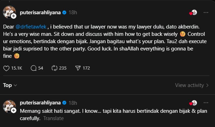 Menurut Puteri Sarah, 40, Dr Afifah atau lebih mesra disapa Dr Fie berada di landasan yang betul apabila diwakili peguam Datuk Akberdin Abdul Kader yang pernah mengendalikan kes perceraiannya sebelum ini.