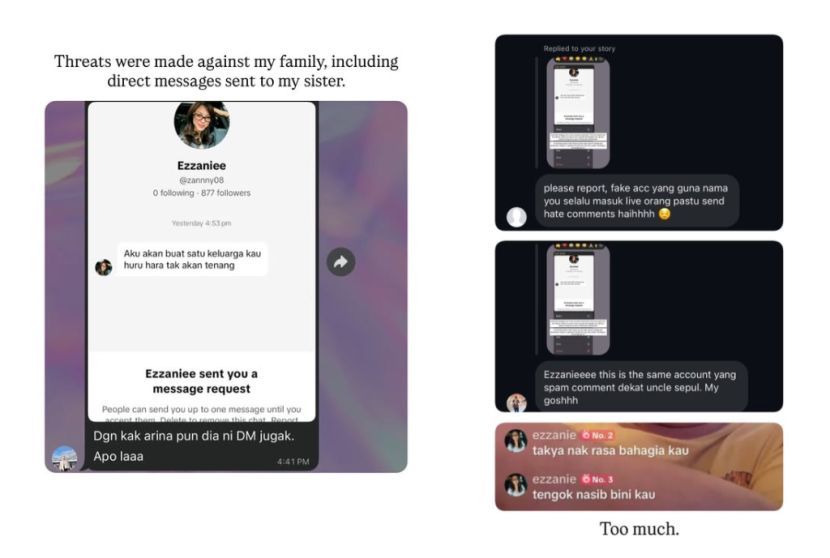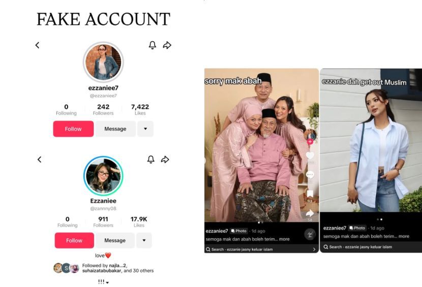 PELAKON Ezzanie Jasny mendedahkan kewujudan beberapa akaun palsu di media sosial yang menyamar sebagai dirinya sehingga menimbulkan kebimbangan terhadap keselamatan keluarga.Ezzanie atau nama sebenarnya Nur Ezzanie Sherazade Jasny, 26, berkata akaun terbabit bukan sahaja menggunakan wajahnya malah turut melibatkan foto ahli keluarga bagi mengelirukan peminat. Lebih membimbangkan, akaun-akaun tersebut turut menyebarkan kenyataan tidak benar berkaitan status agamanya, selain aktif dalam sesi siaran langsung, forum dan ruangan komen.Beberapa akaun palsu yang membuat fitnah.“Ada banyak akaun palsu yang menyamar sebagai saya dan menggunakan gambar peribadi saya serta ahli keluarga tanpa kebenaran.“Akaun-akaun ini juga menyebarkan kenyataan palsu berkaitan agama dan terlibat dalam siaran langsung serta komen yang langsung tidak mencerminkan diri saya,” katanya.Perkara itu dikongsikan menerusi hantaran di Instagram miliknya bersama paparan dua akaun yang dikenal pasti sebagai akaun palsu.ARTIKEL BERKAITAN: Dulu hanya ‘extra‘ lalu lalang, influencer Ezzanie Jasny tak sangka dapat peluang jadi heroin Akasia!ARTIKEL BERKAITAN: Selepas berjaya miliki Mercedes Benz, Ezzanie Jasny kumpul duit beli rumah pulaDalam pada itu, Ezzanie memberitahu keadaan menjadi semakin serius apabila akaun terbabit turut menghantar mesej ugutan kepada ahli keluarganya, termasuk adik perempuannya.“Situasi ini semakin membimbangkan apabila terdapat ancaman terhadap keluarga saya termasuk mesej ugutan yang dihantar secara langsung kepada adik perempuan saya.“Perkongsian ini adalah penjelasan rasmi dan juga amaran. Sebarang bentuk penyamaran, fitnah, gangguan, ugutan atau penyalahgunaan identiti saya selepas ini akan direkodkan dan diambil tindakan sewajarnya,” jelasnya.Menurut Ezzanie, pendedahan itu dibuat bukan untuk mencetuskan kontroversi sebaliknya demi keselamatan diri dan keluarga.Antara mesej ugutan yang diterima ahli keluarga.Dia turut menasihatkan orang ramai agar tidak mudah terpedaya dengan mana-mana akaun palsu yang menggunakan namanya.“Perkongsian ini bukan untuk mencipta drama, tetapi untuk meningkatkan kesedaran dan melindungi keluarga saya.“Jika anda melihat akaun-akaun ini memberi komen, menyertai siaran langsung atau mengeluarkan kenyataan tidak sesuai, ketahuilah itu bukan saya,” katanya lagi.Jadilah sebahagian daripada geng mStar! Follow kami di Telegram, Twitter, TikTok, Facebook, Instagram dan YouTube