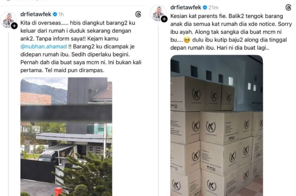 PENYANYI Nubhan dilaporkan membuat laporan polis sejurus selesai mengeluarkan barang peribadi milik bekas isterinya dari kediaman di Senawang, Negeri Sembilan pada 29 Disember lalu.Perkara itu disahkan oleh Ketua Polis Daerah Seremban, Asisten Komisioner Azahar Abdul Rahim pada Ahad. Pihaknya juga memaklumkan menerima laporan daripada bekas isteri Nubhan iaitu Dr Afifah Hidayah Ahmad Tawfek atau lebih dikenali Dr Fie. Nubhan dan Dr Fie berbalas laporan polis.“Polis telah menerima satu laporan yang dibuat oleh penyanyi itu, yang mana dia telah datang ke rumahnya di Taman Lavender Heights untuk mengeluarkan barang-barang milik bekas isterinya bagi dihantar ke rumah bekas mentuanya.“Kemudian, pada 1 Januari lalu, wanita itu pula telah membuat laporan polis kerana tidak berpuas hati dengan tindakan Nubhan yang memindahkan barang-barang kepunyaannya tanpa keizinan,” katanya.Menurut Azahar, pihaknya sudah melakukan siasatan awal namun kedua-dua laporan polis diklasifikasikan sebagai Rujuk Lain Agensi (RLA) dan dirujuk kepada Mahkamah Syariah.ARTIKEL BERKAITAN: Nubhan dah bagi tempoh, mahu diami rumah dibeli… Anak-anak bebas untuk keluar dan masuk… “Saya sedia tanggung kos sewaan kediaman untuk bekas isteri”ARTIKEL BERKAITAN: “Dakwaan barang dicampak tidak benar dan fitnah” - Peguam NubhanSebelum ini, bekas isteri Nubhan memaklumkan kepada media pihaknya membuat laporan polis selepas barangan peribadi miliknya dipindahkan keluar tanpa notis. Katanya, tindakan tersebut dianggap melanggar privasi dan tidak sepatutnya dilakukan tanpa kebenaran. Pada 29 Disember lalu, Dr Afifah mendakwa Nubhan mengeluarkan barang-barang miliknya ketika dia sedang bercuti di Vietnam. Pendedahan yang dibuat Dr Fie sebelum ini.Nubhan dalam satu kenyataan menerusi peguamnya memberitahu dia telah memberi tempoh sehingga habis idah untuk tinggal di rumah yang dibelinya itu. Untuk rekod, Nubhan mendirikan rumah tangga dengan Dr Afifah pada 29 Ogos 2015, namun bercerai talak dua pada awal Disember lalu selepas melalui prosiding di Mahkamah Rendah Syariah Sepang, Selangor. Hasil perkahwinan itu, mereka dikurniakan tiga cahaya mata iaitu Aafiya, 9, Ahmad Aafan, 7, dan Afzan Nayille, 4 tahun.Jadilah sebahagian daripada geng mStar! Follow kami di Telegram, Twitter, TikTok, Facebook, Instagram dan YouTube