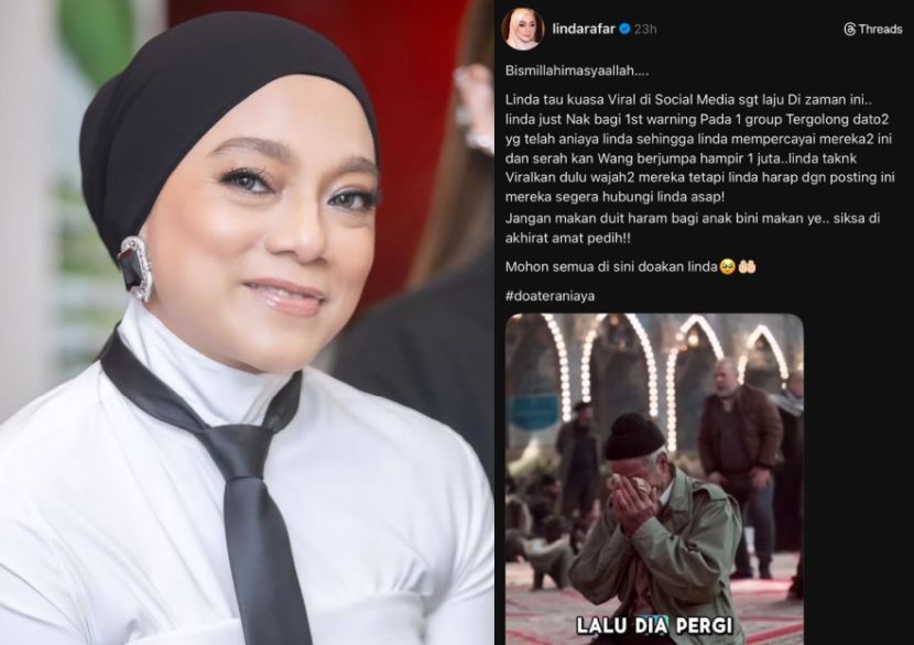 NIAT penyanyi Linda Rafar untuk membantu golongan kurang berkemampuan dan pusat tahfiz terbantut apabila mendakwa menjadi mangsa penipuan melibatkan sekumpulan individu ternama sehingga mengalami kerugian hampir RM1 juta.Linda atau nama sebenarnya Azlinda Abdul Rafar, 47, turut memberi amaran kepada pihak terlibat agar segera memulangkan semula wang berkenaan sebelum dia bertindak mendedahkan identiti mereka kepada umum. Menurut Linda, dia sepatutnya menerima keuntungan dari perniagaan tersebut bermula September tahun lalu, namun sehingga kini satu sen pun tidak diperolehi.Linda sebelum ini turut memberi amaran kepada kumpulan berkenaan di media sosialnya.“Sebenarnya sudah enam bulan kejadian ini berlaku. Saya ada menjalankan perniagaan dengan sekumpulan ‘datuk’ yang diperkenalkan kepada saya. Disebabkan mereka dikenali, saya percaya untuk bekerjasama.“Saya sudah pasang niat dan berjanji, kalau duit itu masuk saya akan sedekahkan kepada pihak yang sepatutnya. Masa itu penuh harapan, yakin akan dapat keuntungan, tapi sampai hari ini satu sen pun tak ada,” katanya ketika dihubungi mStar.Linda mengakui dia bukan jenis mudah meletakkan kepercayaan kepada orang lain, namun tidak menyangka keputusan kali ini membawa kekecewaan besar dalam hidupnya.ARTIKEL BERKAITAN: Linda Rafar u-turn, kekal bersama Elite... Norman KRU berjaya pujukARTIKEL BERKAITAN: Linda Rafar umum keluar EliteJelasnya, disebabkan terlalu yakin, dia sanggup mengeluarkan hampir semua simpanan termasuk wang perniagaan dan dana yang diperuntukkan untuk tahfiz.“Saya tak pernah percaya orang sampai tahap ini, tapi kali ini saya percaya sepenuhnya sampai keluarkan semua duit yang saya ada, hampir RM1 juta.“Ada duit simpanan sendiri, duit perniagaan dan juga duit tahfiz. Macam-macam perancangan saya buat untuk bantu orang susah, memang itu niat saya kalau ada keuntungan,” katanya.Tambah Linda, dia sudah beberapa kali menghubungi pihak berkenaan bagi menuntut semula wang tersebut, namun usaha itu menemui jalan buntu.Linda alami kesedihan yang melampau.Luahnya, sambutan tahun baharu yang sepatutnya bermula dengan sinar harapan bertukar menjadi episod penuh kekecewaan apabila dia merasakan dirinya telah ditipu oleh pihak berkenaan.“Sampai saya merayu minta bayar sikit-sikit sebab saya sudah berjanji dengan ramai orang. Bila tak dapat tunaikan janji, saya rasa sangat down sampai menangis kerana tak mampu tanggung ujian seberat ini.“Saya hampir putus asa, tapi nasib baik saya masih ada iman dan sokongan keluarga yang buatkan saya terus kuat sampai hari ini. Cuma keluarga pun tak tahu perkara ini sebab saya jenis simpan masalah sendiri,” luahnya.Jadilah sebahagian daripada geng mStar! Follow kami di Telegram, Twitter, TikTok, Facebook, Instagram dan YouTube