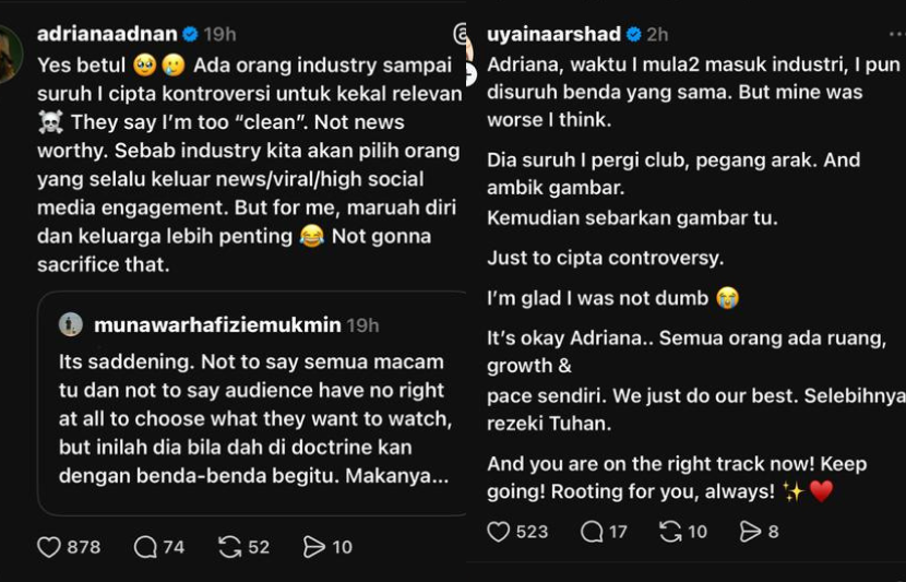 SUSULAN pendedahan pelakon Adriana Adnan yang mendakwa pernah diminta mencipta kontroversi demi kekal relevan dalam industri hiburan, pengacara Uyaina Arshad mendedahkan pengalaman sama dialaminya namun jauh lebih teruk.Menurut Uyaina atau Saidatul Naseha Uyaina Arshad, 34, ketika baru melangkah masuk ke dunia seni dia diminta melakukan perkara bertentangan dengan prinsip diri semata-mata untuk mencipta sensasi. “Adriana, waktu saya mula-mula masuk industri, saya pun disuruh benda yang sama. Tapi pengalaman saya lebih teruk.Uyaina dan Adriana pernah diminta buat kontroversi bagi kekal relevan.“Mereka suruh saya pergi ke kelab malam, pegang arak dan ambil gambar. Kemudian sebarkan gambar tersebut hanya untuk cipta kontroversi,” katanya.Uyaina berkongsi perkara itu ketika membalas Threads milik Adriana pada pagi Khamis.Bagaimanapun, Uyaina bersyukur kerana tidak terpedaya dengan permainan tersebut dan memilih untuk mempertahankan maruah diri serta nilai yang dipegang.Malah Uyaina turut memberikan kata-kata semangat kepada Adriana dengan menyifatkan aktres itu berada di landasan yang betul dan perlu terus melangkah tanpa mengorbankan prinsip diri.ARTIKEL BERKAITAN: Uyaina Arshad belum tahu jantina bayi, mahu kejutan ketika bersalin…. Suami beri kad kredit layankan mengidam emasARTIKEL BERKAITAN: Adriana Adnan ada syarat dalam pemakaian, tolak baju nampak ketiak“Saya bersyukur kerana tidak bodoh dan tidak ikut arahan itu. “Kita buat yang terbaik, selebihnya serahkan kepada Tuhan.“Tak mengapa Adriana, rezeki dan perjalanan setiap orang berbeza. Awak berada di jalan yang betul sekarang. Teruskan, saya sentiasa menyokong,” ujarnya.Sebelum itu, Adriana mendedahkan pernah diminta mencipta kontroversi kerana dianggap terlalu ‘bersih’ dan tidak cukup sensasi untuk menarik perhatian orang ramai.Perkongsian Uyaina dan Adriana di Threads.Menurut Adriana, ada pihak dalam industri menyarankan agar dia melakukan sesuatu yang boleh mencetuskan perhatian umum demi memastikan namanya terus relevan.“Mereka kata saya terlalu ‘clean’ dan tidak cukup ‘newsworthy’. "Industri lebih memilih individu yang sering keluar berita, viral dan mempunyai engagement tinggi di media sosial.“Tapi bagi saya, maruah diri dan keluarga lebih penting. Saya tidak akan mengorbankan perkara itu,” jelasnya.Jadilah sebahagian daripada geng mStar! Follow kami di Telegram, Twitter, TikTok, Facebook, Instagram dan YouTube