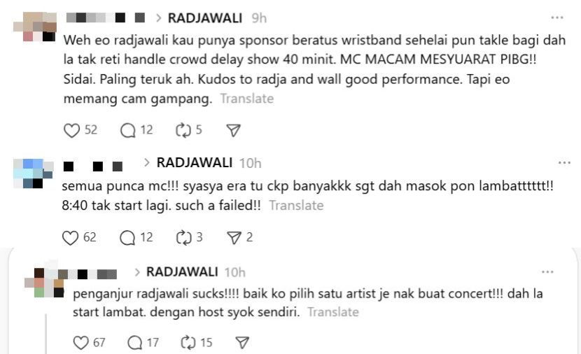NAMA penyampai radio, Shasha Nadira menjadi sasaran kecaman netizen selepas didakwa bersikap ‘syok sendiri’ ketika mengendalikan Konsert RadjaWali yang berlangsung pada malam Sabtu.Rata-rata penonton yang hadir meluahkan rasa kecewa apabila konsert kumpulan kegemaran mereka dari Indonesia itu didakwa bermula lewat gara-gara pengacara majlis (MC) yang bercakap terlalu lama. “Semua punca MC! Syasya Era itu cakap banyak sangat. Dah masuk pun lambat! 8.40 malam tak mula lagi. Sangat gagal!Konsert RadjaWali undang rasa geram penonton.“Baik kau pilih satu artis saja nak buat konsert! Dahlah mula lambat dengan host syok sendiri.“MC pun macam mesyuarat PIBG! Paling teruk, banyak buang masa,” antara komen netizen di ruangan Thread.Tidak berdiam diri, Shasha tampil membalas salah satu komen netizen dan menjelaskan situasi sebenar yang berlaku pada malam berkenaan.ARTIKEL BERKAITAN: Dikritik tak profesional urus majlis nikah Fattah, Amira… Radin terima teguran dengan hati terbukaARTIKEL BERKAIYAN: "Kalau ada jodoh, adalah nanti" - Zeera Azizi buka mulut status hubungan dengan Zhiddin AzizTidak berdiam diri, Shasha tampil membalas salah satu komen netizen dan menjelaskan situasi sebenar yang berlaku pada malam berkenaan.Menurut Shasha, bukan niatnya untuk melewatkan persembahan dua kumpulan terbabit, sebaliknya terdapat masalah teknikal yang memaksanya terus bercakap bagi mengawal keadaan sementara menunggu isyarat daripada pihak produksi.“Bukan syok sendiri, tengah tunggu arahan untuk band bersedia awak. Ada masalah teknikal.“Saya pun kalau boleh tak nak cakap lama-lama. Saya pun minat Radja dan Wali,” jelasnya.Antara komen yang ditinggalkan netizen.Terdahulu, penonton Konsert RadjaWali turut meluahkan rasa berang apabila persembahan Wali Band dihentikan secara mengejut tepat pukul 12 tengah malam, Ahad.Situasi itu mencetuskan rasa tidak puas hati dalam kalangan penonton sehingga ada yang menyerang pihak penganjur dan pasukan produksi.Malah, suasana di dea Live Arena dilaporkan menjadi kecoh apabila penonton menjerit ‘boo’ sebagai tanda protes terhadap pengumuman pemberhentian konsert tersebut.Jadilah sebahagian daripada geng mStar! Follow kami di Telegram, Twitter, TikTok, Facebook, Instagram dan YouTube