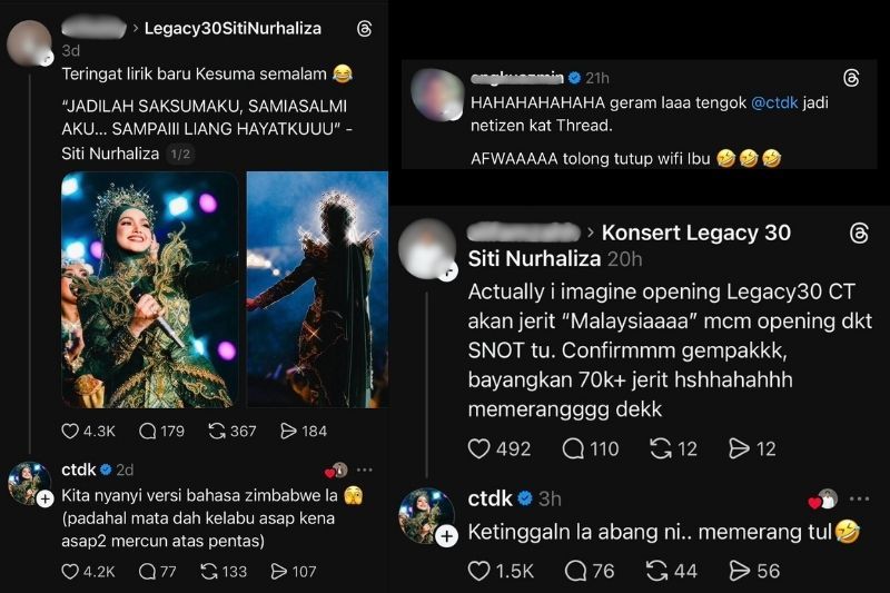 BIDUANITA Negara, Datuk Seri Siti Nurhaliza sekali lagi mencuri perhatian netizen apabila dilihat semakin aktif membalas komen pengikut di aplikasi Threads, selepas kejayaan Konsert Legacy 30: Passion, Sincere and Love yang mendapat sambutan hangat pada Sabtu lalu. Jawapan komen serta hantaran Siti atau Siti Nurhaliza Tarudin, 46, yang dilihat lebih santai dan bersahaja di platform berkenaan membuatkan ramai peminat terhibur. Malah ada yang terkejut apabila komen mereka dibalas secara spontan oleh penyanyi berkenaan.Tindakan Siti membalas komen di Threads menarik perhatian ramai."Comellah Siti, mesti dia lega konsert dah habis. Saja nak lepaskan stress. Ada yang terus 'unavailable post', terkejut kena sergah dengan Tokti (panggilan Siti)," tulis netizen. Tidak kurang juga yang mengusik sikap ceria ibu kepada dua cahaya mata itu, seolah-olah menikmati kehidupan sebagai 'netizen' selepas selesai memikul tanggungjawab besar menjayakan konsert berprestij tersebut."Hahaha geramlah tengok Siti jadi netizen di Threads, Afwa (anak Siti) tolong tutup wifi ibu," tulis netizen.ARTIKEL BERKAITAN: “Kenapa dia buat begitu, apa salah saya pada dia?” - Siti NurhalizaARTIKEL BERKAITAN: Lompat keluar daripada pentas permintaan Siti Nurhaliza, guna teknologi ‘toaster’… “Tidak pilih jalan mudah, keluar zon selesa” - PengurusSebelum ini, Siti jarang dilihat membalas komen dan memberi respons di media social. Pun begitu, sejak berakhirnya Konsert Legacy 30: Passion, Sincere and Love, penyanyi berkenaan dilihat semakin rajin berinteraksi dengan netizen selain memberi bayangan akan ada sebuah lagi konsert besar dalam masa terdekat. Pada 10 Januari lalu, Siti menghiburkan lebih 65,000 penonton yang membanjiri Stadium Nasional Bukit Jalil (SNBJ) menerusi Konsert Legacy 30: Passion, Sincere and Love. Melewati usia 47 tahun, kemampuan vocal Siti terbukti masih utuh apabila berjaya membuat persembahana dengan lebih 40 buah lagu dalam tempoh tiga jam. Antara lagu yang dipersembahkan termasuk Purnama Merindu, Dialah Di Hati, Kau Kekasihku, Jaga Dia Untukku, Menamakanmu Cinta, Balqis dan Nirmala.Jadilah sebahagian daripada geng mStar! Follow kami di Telegram, Twitter, TikTok, Facebook, Instagram dan YouTube