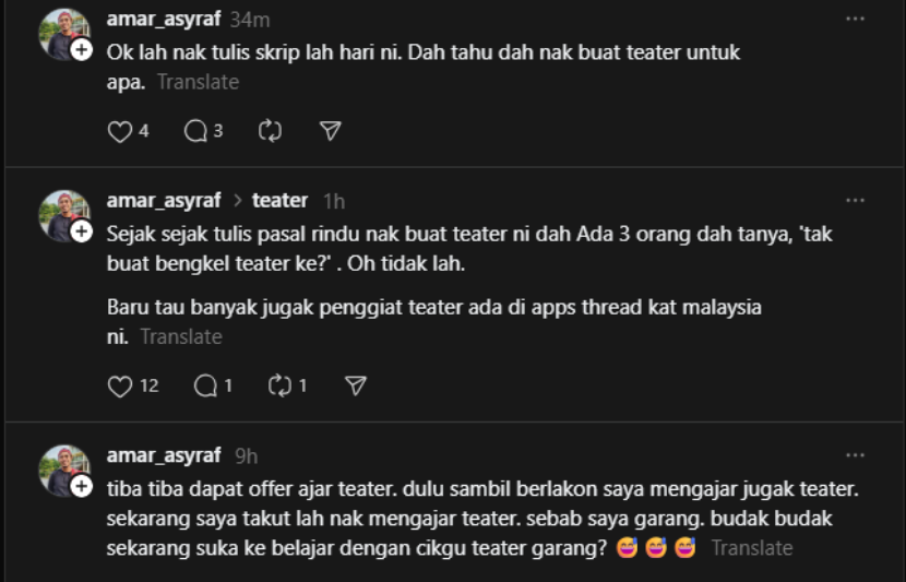 SELEPAS sekian lama tidak aktif dalam pementasan teater, pelakon Amar Asyraf kembali menerima peluang untuk terlibat sebagai tenaga pengajar dalam bidang berkenaan.Mengakui terkejut, Amar atau Amar Asyraf Zailuddin, 40, juga berasa ragu-ragu apabila diberi tugas sebegitu, meskipun pernah berpengalaman mengajar teater sebelum ini.Amar masih pertimbang mahu kembali mengajar teater atau tidak. “Tiba-tiba dapat tawaran ajar teater. Dulu, sambil berlakon saya turut mengajar teater.“Tapi sekarang takut pula nak mengajar sebab saya ini jenis garang. Budak-budak sekarang suka ke belajar dengan cikgu teater yang garang?” katanya.Amar berkongsi perkara itu menerusi satu hantaran di aplikasi Threads miliknya pada Khamis.ARTIKEL BERKAITAN: Diselubungi rasa bersalah pegang bahu Mimi Lana, Amar Asyraf nekad berhenti berlakonARTIKEL BERKAITAN: Akhirnya Amar Asyraf buka mulut dakwaan dah kahwin kali ketiga... Ikut saranan ulama jaga privasi rumah tanggaBerkongsi lanjut, pelakon berkenaan berkata selepas meluahkan kerinduannya terhadap dunia teater, dia menerima beberapa mesej daripada individu yang berminat untuk mengikuti bengkel lakonan.“Sejak tulis fasal rindu nak buat teater, dah ada tiga orang tanya tak buat bengkel teater ke?“Oh, tidaklah. Baru saya tahu rupa-rupanya ramai juga penggiat teater di aplikasi Threads di Malaysia ini,” ujarnya.Perkongsian Amar di Threads miliknya.Bagaimanapun, Amar menjelaskan buat masa ini dia belum merancang untuk membuka sebarang kelas latihan kerana masih menilai komitmen serta kesesuaian masa.Dalam pada itu, pelakon tersebut memberi bayangan bakal kembali aktif dalam dunia teater apabila mula mendapat ilham untuk menghasilkan karya baharu.“Okaylah, nak tulis skrip. Dah tahu dah nak buat teater apa,” katanya.Jadilah sebahagian daripada geng mStar! Follow kami di Telegram, Twitter, TikTok, Facebook, Instagram dan YouTube