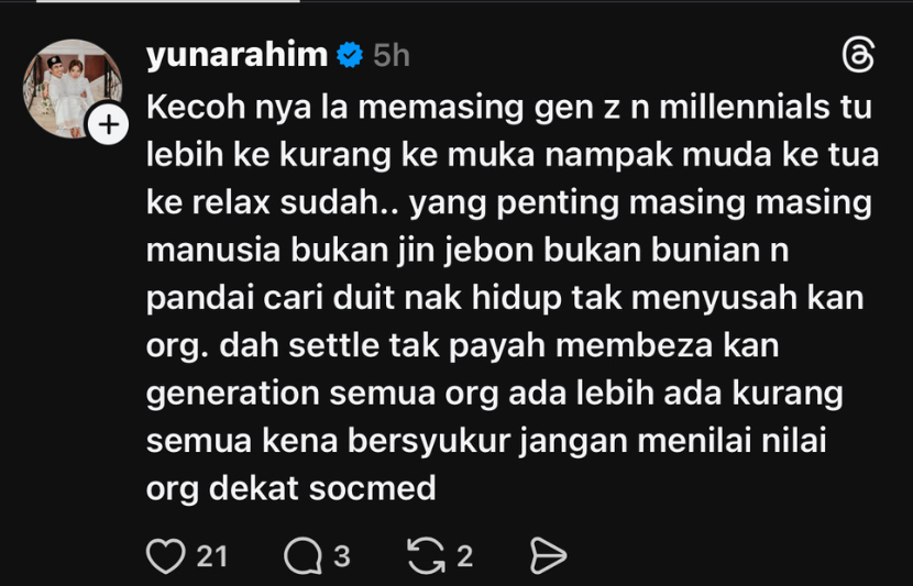 PELAKON Yuna Rahim meluahkan rasa kesal terhadap segelintir netizen yang terlalu cepat menilai orang lain berdasarkan usia, rupa, atau gaya hidup.Menurut Yuna atau Shafiqah Husna Abd Rahim, 32, setiap individu mempunyai cara tersendiri untuk menjalani kehidupan dan perbezaan antara generasi tidak sepatutnya dijadikan bahan perbandingan. “Kecoh sangat masing-masing, Gen Z dan millennials, nak banding muka muda ke tua ke, lebih ke kurang ke… relax saja.Hantaran Yuna menerusi Threads miliknya.“Yang penting, kita semua manusia, bukan jin jebon, bukan bunian, pandai cari duit untuk hidup dan tak menyusahkan orang lain,” katanya.Yuna berkongsi perkara itu menerusi hantaran di Threads miliknya pada Isnin.Dalam pada itu, Yuna menegaskan bahawa netizen seharusnya lebih menghargai apa yang dimiliki sendiri dan tidak cepat menilai kehidupan orang lain di media sosial.“Dah selesai, tak payah nak membezakan generasi. ARTIKEL BERKAITAN: Yuna Rahim turun 9 kg kerana ‘potong’ gula, rezeki makin banyak selepas ada anakARTIKEL BERKAITAN: Mental terganggu lama duduk rumah tak bekerja, Yuna Rahim sanggup tagih ‘job’ pada pihak produksi“Semua orang ada lebih, ada kurang, semua kena bersyukur. Jangan menilai-nilai orang di media sosial,” ujarnya.Menjengah ke ruangan komen rata-rata netizen dilihat menyokong pendapat Yuna dan mengakui mesej itu memberi peringatan yang baik untuk tidak terlalu cepat menilai orang lain, selain menekankan pentingnya bersyukur dengan apa yang dimiliki.Sebelum ini, tular di media sosial mengenai generasi millennials yang memuat naik gambar diri sendiri sambil menyatakan umur dan muka mereka kelihatan seperti Gen Z.Jadilah sebahagian daripada geng mStar! Follow kami di Telegram, Twitter, TikTok, Facebook, Instagram dan YouTube