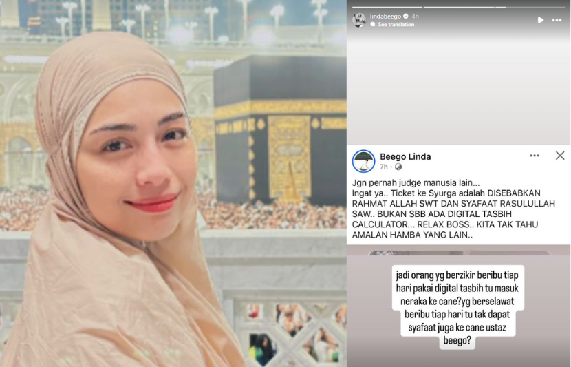 PELAKON Linda Hashim secara sinis mempersoalkan kenyataan suaminya, aktor Beego, berhubung amalan dalam kehidupan seharian.Menerusi satu hantaran di Instagram, Linda atau Norhazlinda Hashim, 42, dilihat seakan-akan tidak bersetuju apabila Beego mempertikaikan penggunaan tasbih digital seperti yang sering diamalkan ramai orang. “Jadi orang yang berzikir beribu kali setiap hari menggunakan tasbih digital itu masuk neraka ke macam mana?Linda seakan-akan tidak setuju dengan kenyataan Beego.“Yang berselawat beribu kali setiap hari itu tidak mendapat syafaat juga ke macam mana, Ustaz Beego?” sindir Linda.Linda berkongsi perkara itu menerusi hantaran di Insta Story miliknya pada pagi Khamis.Sebelum itu, Beego mengeluarkan kenyataan menjelaskan bahawa amalan ibadah seseorang bukan sekadar diukur melalui kiraan pada tasbih digital.Hantaran Beego itu turut mengingatkan agar tidak mudah menghakimi orang lain.ARTIKEL BERKAITAN: “Salah ke minta izin dulu nak pergi umrah?” - BeegoARTIKEL BERKAITAN: “Dia tak layak jadi khalifah” – Linda Hashim jawab tak perlu izin Beego pergi umrah“Jangan pernah menghakimi manusia lain.“Ingatlah, tiket ke syurga adalah kerana rahmat Allah SWT dan syafaat Rasulullah SAW, bukan semata-mata kerana angka pada tasbih digital atau kalkulator untuk mengira amalan.“Tenang. Kita tidak pernah tahu amalan hamba Allah yang lain,” ujarnya.Sejak Januari tahun lalu, rumah tangga Linda dan Beego, atau nama sebenarnya Mohamad Aszerul Nizam Abdullah, 45, menjadi tumpuan apabila aktres itu memfailkan perceraian atas alasan tiada persefahaman.Linda memberi sindiran sinin buat Beego di Instastory miliknya.Mereka pernah bercerai pada 27 Mac 2023, namun mencapai kata sepakat untuk rujuk pada 9 April 2023, selain membatalkan tuntutan nafkah dan hak penjagaan tiga anak mereka.Linda bagaimanapun mendakwa mereka bercerai buat kali kedua selepas beberapa bulan rujuk, namun kembali bersama tidak lama selepas itu.Mahkamah Rendah Syariah Wilayah Persekutuan Kuala Lumpur menangguhkan prosiding pengesahan lafaz taklik pasangan ini ke 9 Februari depan.Pasangan ini mendirikan rumah tangga pada Jun 2013 dan dikurniakan tiga cahaya mata iaitu Jelita Clarissa, 11, Anggun Cassandra, 10, dan Indah Camelia, 6.Jadilah sebahagian daripada geng mStar! Follow kami di Telegram, Twitter, TikTok, Facebook, Instagram dan YouTube