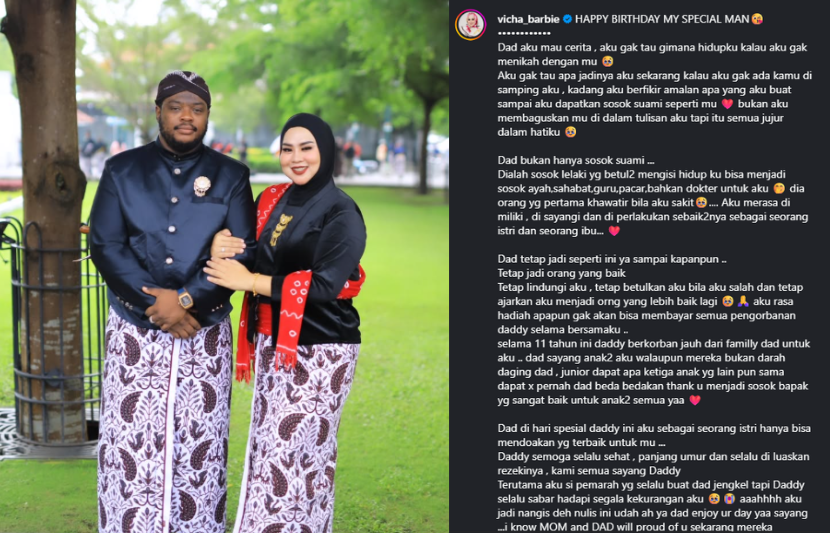 PELAWAK Vicha Saywho berkongsi luahan kata-kata manis selain rasa syukur buat suami tercinta sempena sambutan ulang tahun kelahiran lelaki itu.Bagi Vicha atau Refika Novianti Faturohman, 38, perkahwinan bersama Johnson merupakan satu anugerah kerana dia mendapat kasih sayang sepenuhnya sepanjang mereka bersama. “Dad (panggilan Johnson), aku ingin bercerita. Aku tidak tahu bagaimana hidupku jika aku tidak berkahwin denganmu.Vicha sifatkan Johnson sebagai suami penyayang.“Aku juga tidak tahu apa yang akan jadi pada diriku sekarang sekiranya tidak mempunyai kamu di sisi. Kadang-kadang aku terfikir, amalan apakah yang aku lakukan sehingga Allah menghadiahkan aku seorang suami sepertimu,” katanya.Vicha berkongsi perkara itu menerusi satu hantaran di Instagram miliknya pada petang Rabu berserta beberapa keping gambar romantis mereka berdua.Dia turut meluahkan penghargaan atas pengorbanan Johnson yang sentiasa menyayangi anak kandung mereka selain tiga cahaya mata Vicha hasil perkahwinan terdahulu.ARTIKEL BERKAITAN: Lelaki Nigeria lebih penyayang, Vicha tolak cinta jejaka MelayuARTIKEL BERKAITAN: Malaysia saksi kebangkitan hidup, Vicha Saywho reda belum rezeki dapat IC biru“Aku rasa tiada hadiah di dunia ini yang mampu membalas semua pengorbananmu sepanjang kita bersama. Selama 11 tahun ini, kamu sanggup berkorban berjauhan dengan keluarga demi aku.“Kamu menyayangi anak-anakku walaupun mereka bukan darah dagingmu. Junior (panggilan anak bongsu) mendapat layanan yang sama seperti tiga anak yang lain, tidak pernah sekalipun kamu membeza-bezakan mereka,” luahnya.Vicha sempat menitip doa buat Johnson selain mengharapkan keluarga mereka terus bahagia.Perkongsian Vicha di Instagram miliknya.Untuk rekod, Vicha dan Johnson mendirikan rumah tangga pada Ogos 2018 dan hasil perkahwinan tersebut, mereka dikurniakan seorang cahaya mata lelaki bernama Michael Taylor Ayomide yang kini berusia enam tahun.Johnson merupakan lelaki asal Nigeria dan mereka bernikah di Kuala Lumpur.Vicha sebelum ini pernah berkahwin dan mempunyai tiga orang anak perempuan iaitu Aurel Angelina Kheyza, Listy Arun Tresnasih dan Michelle Averina Chalista.Jadilah sebahagian daripada geng mStar! Follow kami di Telegram, Twitter, TikTok, Facebook, Instagram dan YouTubeTONTON VIDEO PILIHAN!