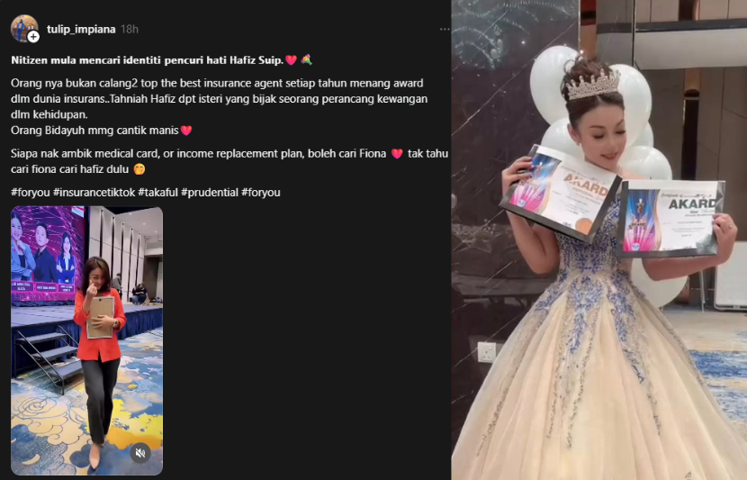 SELEPAS penyanyi Hafiz Suip mengejutkan peminat dengan berita perkahwinannya dengan Fiona Saffiyya, rata-rata netizen mula mencari identiti wanita bertuah itu.Menerusi perkongsian di akaun Threads tulip_impiana, Fiona dipercayai bekerja sebagai ejen insurans berjaya yang sering memenangi anugerah setiap tahun dalam industri tersebut. Malah, pemilik akaun itu menyifatkan Hafiz atau Mohamad Hafiz Mohamad Suip, 36, beruntung dikurniakan seorang perancang kewangan yang hebat.Hafiz dan Fiona sah bergelar suami isteri pada Jumaat lalu."Netizen mula mencari identiti pencuri hati Hafiz Suip. "Orangnya bukan calang-calang, Fiona seorang top ejen insurans yang setiap tahun memenangi anugerah dalam dunia insurans. "Tahniah Hafiz kerana mendapat isteri yang bijak, seorang perancang kewangan dalam kehidupan. Orang Bidayuh memang cantik dan manis," tulisnya.ARTIKEL BERKAITAN: Hafiz Suip kembali bergelar suamiARTIKEL BERKAITAN: Hafiz Suip imamkan solat jenazah ibu, Ajai terbang ke Sarawak beri penghormatan terakhirPada hantaran berkenaan, individu itu turut berkongsi kejayaan Fiona dalam bidang insurans. Tidak hanya itu, Fiona juga dikatakan pernah mencuba nasib dalam dunia hiburan sebagai penyanyi selepas menyertai program My Starz LG musim kedua.Pada Jumaat, Hafiz Suip kembali sah bergelar suami kepada Fiona dalam majlis yang berlangsung di sebuah dewan di Petrajaya Kuching. Perkongsian tulip_impiana di akaun Threads miliknya.Majlis yang diadakan secara tertutup itu hanya dihadiri oleh ahli keluarga terdekat.Untuk rekod, Hafiz sebelum ini pernah berkahwin dengan Nureffy Jasreel pada 2016 dan sah bercerai pada Mei tahun lalu. Hasil perkongsian hidup, mereka dikurniakan dua cahaya mata iaitu Muhammad Riyadh Zafri, 9, dan Muhammad Alkaf Zayne, 6.Jadilah sebahagian daripada geng mStar! Follow kami di Telegram, Twitter, TikTok, Facebook, Instagram dan YouTubeTONTON VIDEO PILIHAN!