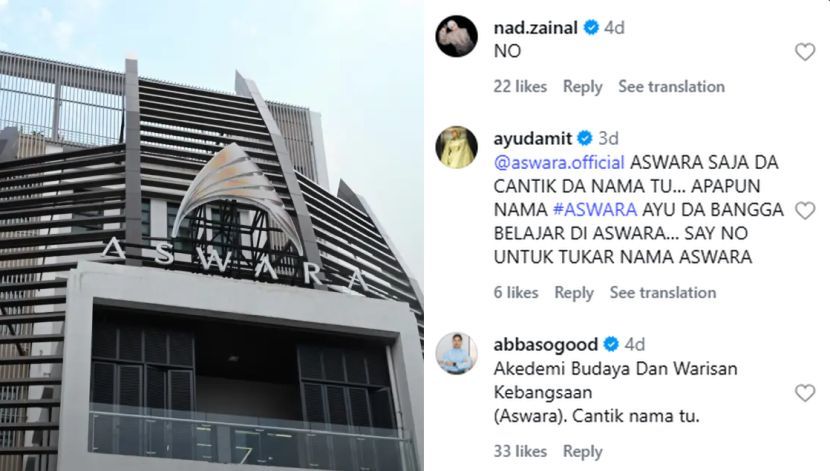 CADANGAN penjenamaan semula Akademi Seni Budaya dan Warisan Kebangsaan (Aswara) kepada Universiti P. Ramlee (UPR) kembali mencetuskan perdebatan hangat dalam kalangan alumni dan pelajar institusi berkenaan.Perkara itu turut menarik perhatian beberapa selebriti yang tidak bersetuju cadangan itu diteruskan memandangkan Aswara sudah dikenali sebagai pusat pembinaan bakat dan ruang penghasilan karya kreatif. Antara selebriti yang membantah usaha penjenamaan Aswara kepada UPR ialah Nad Zainal. Antara komen yang dtinggalkan oleh para alumni.“Tidak,” tulis Nad di ruangan komen pada hantaran foto artikel bertajuk ‘Cadangan Jenamakan Aswara Sebagai Universiti P. Ramlee Kembali Dibangkitkan’ yang dimuat naik portal Bernama di Instagram baru-baru ini. Selain itu, penyanyi Ayu Damit yang kini melanjutkan pengajian di Aswara turut tidak bersetuju nama Aswara diubah.“Aswara saja sudah cantik nama itu. Apa-apa pun saya dah bangga belajar di Aswara. Jadi jawapannya tidak untuk tukar nama Aswara,” tulisnya.ARTIKEL BERKAITAN: Aswara Wujudkan Fakulti Animasi Pertama Di Negara IniARTIKEL BERKAITAN: Tahniah! Zul Huzaimy, Syafinaz dilantik sebagai Ahli Lembaga Pengarah Aswara - “Saya akan jalankan tanggungjawab ini sebaik mungkin”Selain Nad Zainal dan Ayu, terdapat beberapa selebriti lain yang tidak mahu nama institusi itu diubah seperti Abbas Mahmood, Ewan Fauzi, Reza Mohamed dan Azizul Haqim.Meninjau ke ruangan komen pada hantaran foto yang dimuat naik, rata-rata netizen turut berpandangan penjenamaan semula itu tidak mempunyai keperluan mendesak dan berharap nama Aswara terus dikekalkan.Terdahulu cadangan menjenamakan Aswara kepada UPR pernah disuarakan sekitar 2015, namun masih belum direalisasikan sehingga hari ini. Penjenamaan itu difahamkan sebagai penghormatan terhadap sumbangan besar Allahyarham Tan Sri P. Ramlee ke peringkat institusi serta mengekalkannya sebagai rujukan utama dalam landskap seni tanah air.Jadilah sebahagian daripada geng mStar! Follow kami di Telegram, Twitter, TikTok, Facebook, Instagram dan YouTube