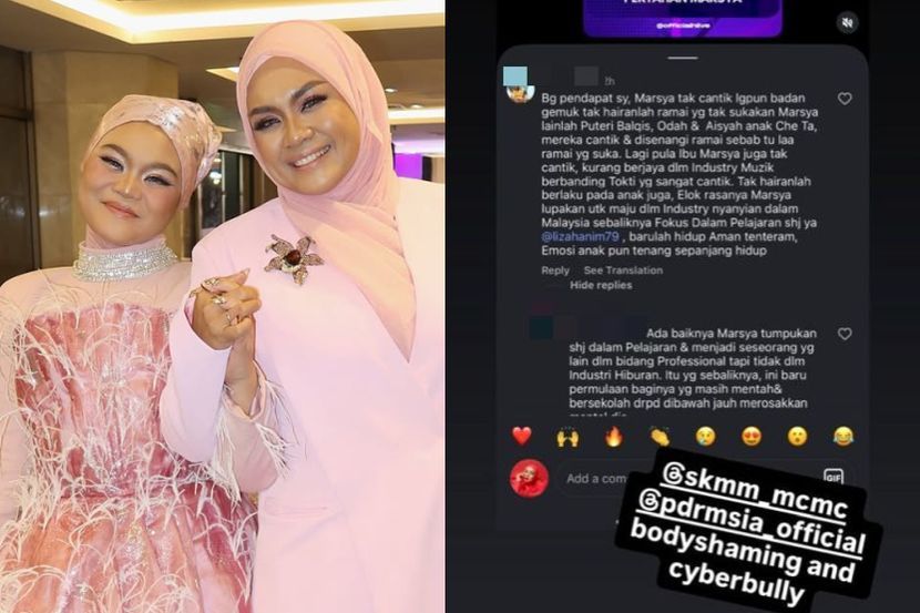 TIDAK cukup anaknya dikatakan kurang menyerlah, penyanyi Liza Hanim sekali lagi meluahkan rasa kecewa apabila fizikal Marsya menjadi bahan kutukan di media sosial. Tanpa banyak bicara Liza, 46, terus membuat aduan dengan meletakkan akaun rasmi Polis Diraja Malaysia (PRDM) serta Suruhanjaya Komunikasi dan Multimedia Malaysia (MCMC) berserta tangkap layar komen keterlaluan terhadap anaknya dalam satu hantaran di InstaStory. Malah dia juga secara terbuka mendedahkan nama serta gambar pengendali akaun tersebut yang dianggap sebagai pembuli. Liza mendedahkan komen keterlaluan terhadap anaknya. "Body shaming dan buli siber," tulisnya ringkas di InstaStory pada petang Sabtu. Menerusi tangkap layar yang dimuat naik, individu berkenaan mengutuk wajah serta fizikal Marsya selain turut membuat perbandingan dengan beberapa selebriti muda lain.Lebih teruk lagi dia menganggap Marsya tidak berjaya sama seperti perjalanan Liza dalam dunia seni.ARTIKEL BERKAITAN: Anak dianggap tak menyerlah lepas TTMM, Liza Hanim kecewa Marsya jadi sasaran kecaman netizen ARTIKEL BERKAITAN: Liza Hanim bangga kejayaan anak, Marsya serah kepada ‘manager’ urus duit kemenangan TTMMKomen tersebut dipercayai susulan luahan rasa kecewa Liza sendiri apabila ada pihak yang membandingkan perjalanan seni anaknya selepas bergelar juara program Talk To My Manager (TTMM). "Ada baiknya Marsya tumpukan sahaja dalam pelajaran dan menjadi seorang yang lain dalam bidang profesional tetapi tidak dalam industri hiburan," tulis individu berkenaan. Marsya menjadi sasaran kecaman di media sosial. Sebelum ini Liza berkongsi luahan bagaimana Marsya berdepan situasi dibuli di media sosial. Bahkan dia sendiri beranggapan ia tidak seharusnya berlaku memandangkan anaknya itu kini sedang bergelut dengan kerjaya seni selain jadual kuliah.Jadilah sebahagian daripada geng mStar! Follow kami di Telegram, Twitter, TikTok, Facebook, Instagram dan YouTube