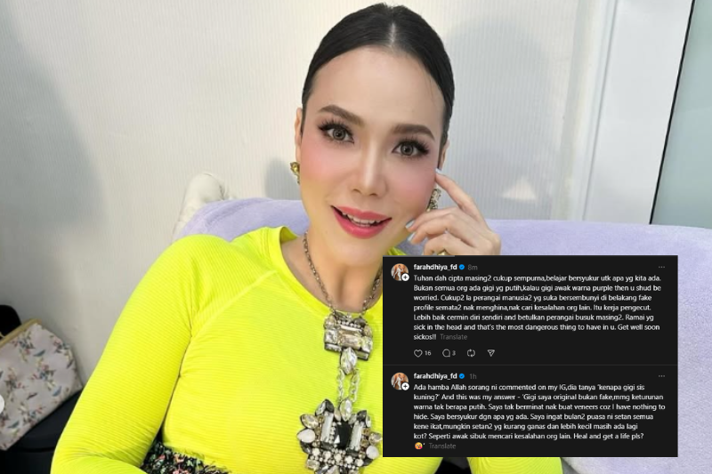 PENYANYI dan pelakon Farahdhiya menegur tindakan seorang individu yang mempersoalkan warna giginya yang kelihatan terlalu kuning.Farahdhiya atau nama sebenarnya Nur Farahdhiya Mohd Amin, 42, berkata dia selesa dengan warna tersebut selain tidak mengenakan gigi palsu tiruan. “Ada hamba Allah ini komen dekat Instagram saya, dia tanya kenapa gigi sis kuning?Farahdhiya selar tindakan netizen suka cari salah.“Gigi saya original, bukan fake. Memang keturunan warna tak berapa putih,” katanya menerusi hantaran di Threads. Menurut Farahdhiya, tiada keperluan melakukan rawatan kosmetik yang berlebih kerana lebih selesa tampil dengan diri sendiri.“Saya tak berminat nak buat veneers sebab tak ada benda yang saya nak sorok. Saya bersyukur dengan apa yang ada.ARTIKEL BERKAITAN: “Tak matang dan tiada kelas” - Farahdhiya ‘sound’ individu buka aib bekas pasangan lepas berpisahARTIKEL BERKAITAN: Pernah jadi mangsa, Farahdhiya tendang pembuli sampai tergolek"Bukan semua orang ada gigi yang putih, kalau gigi awak warna purple mungkin awak kena risau,” ujarnya.Dalam masa sama, Farahdhiya turut menegur sikap segelintir individu yang gemar mencari kesalahan orang lain, lebih-lebih lagi ketika bulan Ramadan.Katanya, tindakan itu selalunya dilakukan oleh golongan pengecut dan hanya menggunakan akaun palsu untuk menghina orang lain.Farahdhiya yakin dengan diri sendiri.“Saya ingat bulan-bulan puasa ini setan semua kena ikat. Mungkin setan yang kurang ganas dan lebih kecil masih ada lagi kot.“Seperti awak sibuk mencari kesalahan orang lain. Heal and get a life please?” katanya lagi.Jadilah sebahagian daripada geng mStar! Follow kami di Telegram, Twitter, TikTok, Facebook, Instagram dan YouTube