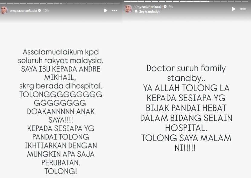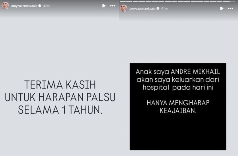 PELAKON Amyza Aznan membuat keputusan mengeluarkan anak sulungnya yang sedang menerima rawatan akibat kanser paru-paru di Hospital Kuala Lumpur (HKL) pada Isnin.Amyza, 49, bagaimanapun tidak mendedahkan secara terperinci mengenai punca keputusan tersebut, sebaliknya menyerahkan soal kesembuhan anaknya, Andre Mikhail kepada keajaiban. “Terima kasih untuk harapan palsu selama setahun. Anak saya Andre Mikhail akan keluar dari hospital pada hari ini. Hanya mengharap keajaiban,” tulisnya menerusi hantaran di InstaStory. Luahan Amyza mengenai keadaan anaknya.Menerusi beberapa hantaran yang dimuat naik, Amyza dilihat setia berada di pangkuan anaknya yang berada dalam keadaan tidak bermaya.Malah Amyza juga memaklumkan pihak perubatan meminta ahli keluarga untuk bersedia dengan sebarang kemungkinan yang bakal berlaku.Tidak bersedia menerima kenyataan itu, pelakon berkenaan turut memohon orang ramai mendoakan kesihatan anaknya selain mencadangkan ikhtiar lain yang bersesuaian.ARTIKEL BERKAITAN: “Andre masih kimoterapi, Adrian bakal menyusul” – Amyza Aznan kongsi perkembangan anak di live TikTok, bukan nak menagih ‘gift’ARTIKEL BERKAITAN: Anak kedua Amyza Aznan kuat berdepan ujian, sempat kongsi perkembangan selepas disahkan hidap kanser tulang“Saya sekarang berada di hospital, tolong doakan anak saya. Kepada sesiapa yang pandai, tolong ikhtiarkan dengan mungkin apa sahaja perubatan.“Doktor suruh keluarga bersedia, Ya Allah tolonglah. Sesiapa yang bijak pandai, hebat dalam bidang selain hospital,” katanya.Sementara itu, usaha mStar untuk mengetahui lebih lanjut keadaan anaknya bagaimanapun tidak berjaya apabila panggilan telefon tidak dijawab.Hantaran meminta orang ramai membantu keadaan anaknya.Pada 15 Februari tahun lalu, Amyza berkongsi khabar duka Andre disahkan menghidap kanser paru-paru tahap tiga. Perkara tersebut dimaklumkan oleh Amyza sendiri selepas tiga minggu anak sulungnya itu menerima rawatan di Hospital Ampang, Selangor. Andre kemudian dipindahkan ke HKL bagi mendapatkan rawatan lanjut.Jadilah sebahagian daripada geng mStar! Follow kami di Telegram, Twitter, TikTok, Facebook, Instagram dan YouTube