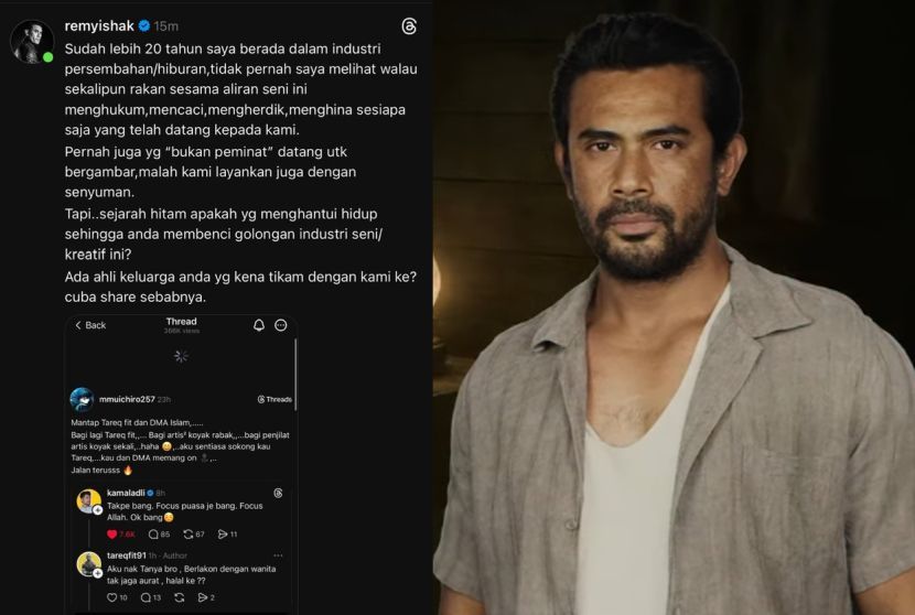 PELAKON Datuk Remy Ishak tampil bersuara apabila kerjaya lakonan dipersoalkan dan didakwa sebagai sumber rezeki tidak halal oleh personaliti media sosial, Tareq Fit.Remy atau nama sebenarnya Mohammad Zalimei Ishak, 43, meluahkan rasa kesal terhadap kenyataan tersebut yang disifatkan seakan-akan memperlekeh golongan anak seni. Katanya sepanjang bergelar artis, dia tidak pernah menyaksikan mana-mana rakan seperjuangan bertindak menghukum atau menghina individu lain, meskipun berdepan pelbagai ragam masyarakat.Luahan Remy di hantaran Thread miliknya.“Sudah lebih 20 tahun saya berada dalam industri persembahan atau hiburan, tidak pernah saya melihat walau sekalipun rakan sesama aliran seni ini menghukum, mencaci, mengherdik atau menghina sesiapa saja yang datang kepada kami.“Pernah juga yang bukan peminat datang untuk bergambar, malah kami layan juga dengan senyuman,” katanya menerusi hantaran di Threads.Dalam hantaran tersebut, Remy turut memuat naik tangkap layar perbalahan melibatkan Tareq dan pelakon Kamal Adli sehingga mencetuskan perdebatan hangat dalam kalangan netizen.Dalam pada itu, Remy turut mempersoalkan punca sebenar individu tersebut yang dikatakan membenci golongan industri seni kreatif.ARTIKEL BERKAITAN: Kamal Adli ‘sound’ Tareq Fit minta fokus ibadah puasa, jangan sibuk cari salah orang… “Cukup-cukuplah, kita di Malaysia hidup harmoni”ARTIKEL BERKAITAN: Remy Ishak cedera di lokasi penggambaran, alami keretakan tulang rusuk“Tapi sejarah hitam apakah yang menghantui hidup sehingga anda membenci golongan industri seni atau kreatif ini? Ada ahli keluarga yang kena tikam dengan kami ke? Cuba kongsi sebabnya,” ujarnya lagi.Terdahulu, konflik tercetus apabila Kamal menegur Tareq agar memberi tumpuan kepada ibadah puasa dan tidak mempersoalkan penghasilan lagu raya oleh pempengaruh berperwatakan lembut.Bagaimanapun, teguran itu dipercayai tidak diterima baik apabila Tareq hingga mempersoalkan kerjaya lakonan Kamal dan mendakwa aktor berkenaan mencari rezeki dengan cara tidak halal kerana berlakon bersama wanita yang tidak menjaga aurat.Isu tersebut kini hangat diperkatakan di media sosial dengan rata-rata netizen mempertahankan golongan anak seni dan menyifatkan kenyataan berkenaan sebagai keterlaluan.Jadilah sebahagian daripada geng mStar! Follow kami di Telegram, Twitter, TikTok, Facebook, Instagram dan YouTube