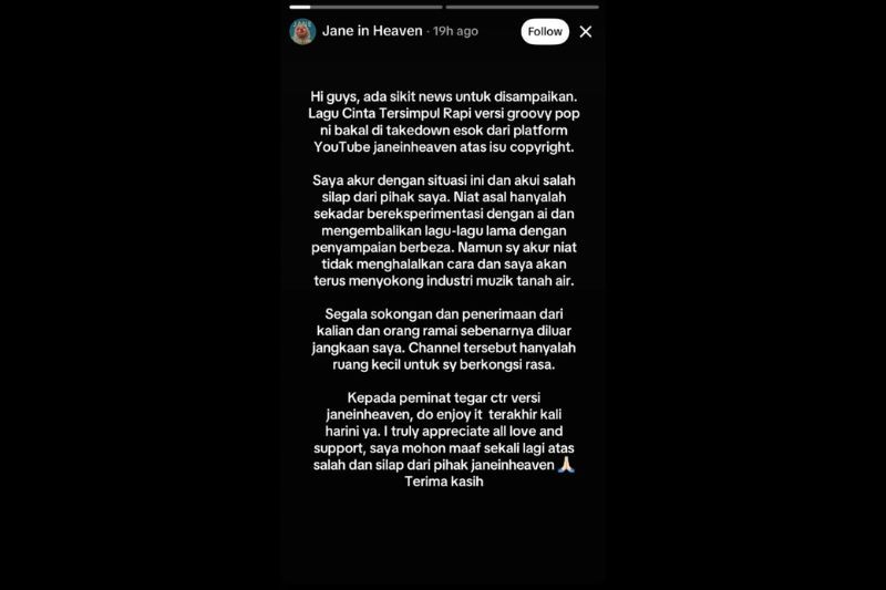 LAGU Cinta Tersimpul Rapi versi 'groovy pop' yang dimuat naik di platform muzik milik individu dikenali sebagai Jane In Heaven terpaksa diturunkan susulan isu hak cipta.Menerusi hantaran di TikTok Story, Jane menjelaskan tujuan asal penghasilan versi tersebut adalah untuk bereksperimen menggunakan teknologi kecerdasan buatan (AI), selain memberi nafas baharu kepada lagu-lagu lama dengan pendekatan berbeza. Namun begitu, selepas menerima teguran, dia mengambil tanggungjawab penuh atas kesilapan yang berlaku dan akur dengan tindakan yang diambil.Perkongsian Jane di TikTok miliknya."Hai, ada sedikit berita untuk disampaikan. Lagu Cinta Tersimpul Rapi versi groovy pop ini bakal diturunkan dari platform YouTube janeinheaven atas isu copyright. "Saya akur dengan situasi ini dan akui salah silap daripada pihak saya. Niat asal hanyalah sekadar bereksperimentasi dengan AI dan menggembalikan lagu-lagu lama dengan penyampaian berbeza. "Namun saya akur niat tidak menghalalkan cara dan saya akan terus menyokong industri muzik tanah air," katanya. ARTIKEL BERKAITAN: Anis Suraya enggan kembali ke dunia seni, impian peminat lihat sertai Gegar Vaganza tidak akan berlakuARTIKEL BERKAITAN: Aznil Nawawi bimbang generasi muda terbuai dengan teknologi... “Tidak mustahil anak-anak tak lagi menangis kehilangan ibu bapa kerana lebih ‘attached’ dengan AI”Dalam pada itu, Jane turut meluahkan rasa terharu serta menzahirkan penghargaan atas sokongan luar biasa yang diterima daripada orang ramai.Menurutnya, platform tersebut sekadar ruang kecil untuk berkongsi minat dan kreativiti."Segala sokongan dan penerimaan daripada kalian (pendengar) dan orang ramai sebenarnya di luar jangkaan saya. "Platform tersebut hanyalah ruang kecil untuk saya berkongsi rasa. Lagu Cinta Tersimpul Rapi dipopularkan oleh Anis."Saya sangat menghargai sokongan anda semua, saya mohon maaf sekali lagi atas salah dan silap daripada pihak janeinheaven. Terima kasih," ujarnya. Terdahulu, Cinta Tersimpul Rapi merupakan lagu ciptaan komposer Dr Azmeer dengan lirik oleh Lukhman S yang dilancarkan pada tahun 1999. Versi AI yang dimuat naik pada Disember tahun lalu itu berjaya meraih jutaan tontonan di YouTube sebelum diturunkan.Jadilah sebahagian daripada geng mStar! Follow kami di Telegram, Twitter, TikTok, Facebook, Instagram dan YouTube