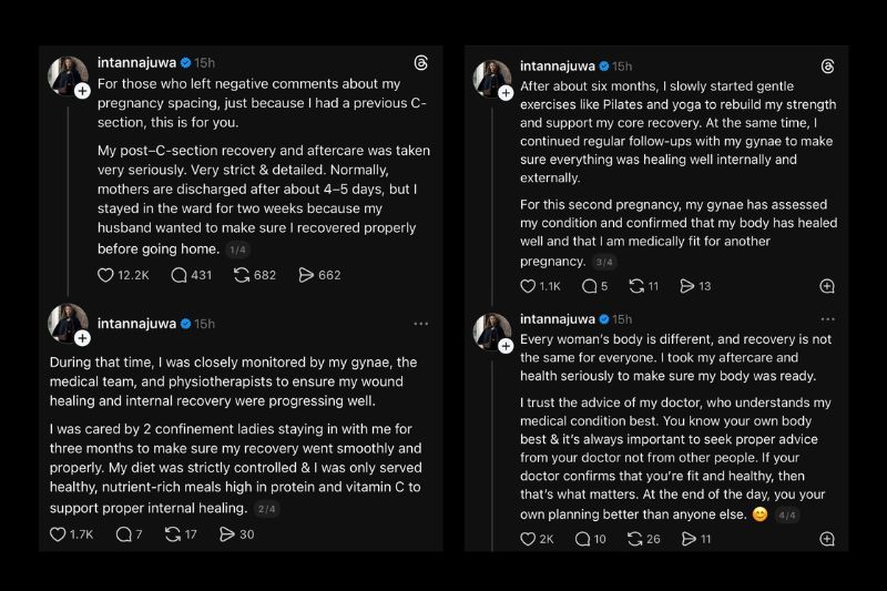 SUSULAN menerima pelbagai komen netizen, pelakon Datin Intan Najuwa tampil memberikan penjelasan berhubung jarak kehamilan keduanya yang dianggap terlalu dekat memandangkan dia melahirkan anak pertama secara pembedahan Caesarean (C-section). Intan atau Intan Najuwa Abdul Wahid, 29, berkata keputusan untuk hamil semula bukan dibuat secara terburu-buru tetapi selepas mendapat pengesahan dan nasihat daripada pakar sakit puan yang memantau tahap kesihatannya. Katanya, sebelum merancang kehamilan kedua, doktor telah menilai keadaan fizikalnya dan mengesahkan tubuhnya telah pulih sepenuhnya serta berada dalam keadaan selamat untuk hamil semula."Untuk kehamilan kedua ini, pakar sakit puan saya telah menilai keadaan dan mengesahkan bahawa tubuh saya telah pulih dengan baik serta layak dari segi perubatan untuk hamil sekali lagi.Perkongsian Intan di Threads miliknya."Setiap wanita mempunyai tubuh yang berbeza, dan proses pemulihan juga tidak sama bagi semua orang."Saya mengambil serius penjagaan selepas bersalin dan kesihatan saya untuk memastikan tubuh saya benar-benar bersedia," katanya. Dalam pada itu, Intan menegaskan proses pemulihan selepas pembedahan C-section dijalankan secara teliti dan berdisiplin.Menurutnya, walaupun kebanyakan ibu dibenarkan pulang selepas empat hingga lima hari, dia memilih untuk tinggal lebih lama di hospital atas faktor keselamatan dan pemantauan kesihatan.ARTIKEL BERKAITAN: Intan Najuwa hamil anak keduaARTIKEL BERKAITAN: Kerja 7 pagi hingga 7 malam, Intan Najuwa tak sanggup berjauhan dengan anak"Pemulihan dan penjagaan selepas C-section saya diambil dengan sangat serius, ketat dan terperinci."Kebiasaannya, ibu dibenarkan pulang selepas kira-kira 4–5 hari, tetapi saya tinggal di wad selama dua minggu kerana suami saya mahu memastikan saya benar-benar pulih sebelum pulang ke rumah."Sepanjang tempoh itu, saya dipantau dengan rapi oleh pakar sakit puan, pasukan perubatan dan ahli fisioterapi bagi memastikan penyembuhan luka serta pemulihan dalaman berjalan dengan baik," ujarnya. Pelakon drama Kekasih Paksa Rela itu turut memaklumkan dia mendapatkan khidmat dua penjaga yang tinggal bersamanya selama tiga bulan."Saya dijaga oleh dua orang penjaga berpantang yang tinggal bersama saya selama tiga bulan untuk memastikan proses pemulihan berjalan lancar dan sempurna."Pemakanan saya dikawal dengan ketat dan saya hanya diberikan makanan sihat yang kaya dengan nutrien, tinggi protein dan vitamin C untuk menyokong penyembuhan dalaman yang baik."Selepas kira-kira enam bulan, saya mula melakukan senaman ringan seperti pilates dan yoga secara perlahan-lahan untuk membina semula kekuatan serta menyokong pemulihan otot teras," katanya. Intan (dua dari kanan) dan suami bakal menimang cahaya mata kedua tidak lama lagi.Pada Khamis, Intan berkongsi khabar gembira apabila disahkan hamil anak kedua. Dalam perkongsian itu, Intan turut memuat naik foto imbasan kehamilan yang dipegang oleh anak sulungnya, Imane Lunara. Untuk rekod, Intan mendirikan rumah tangga dengan usahawan Datuk Ahmad Azraf Azman pada Ogos 2023.Hasil perkahwinan itu mereka dikurniakan anak pertama iaitu Lunara pada 15 Disember 2024.Jadilah sebahagian daripada geng mStar! Follow kami di Telegram, Twitter, TikTok, Facebook, Instagram dan YouTube