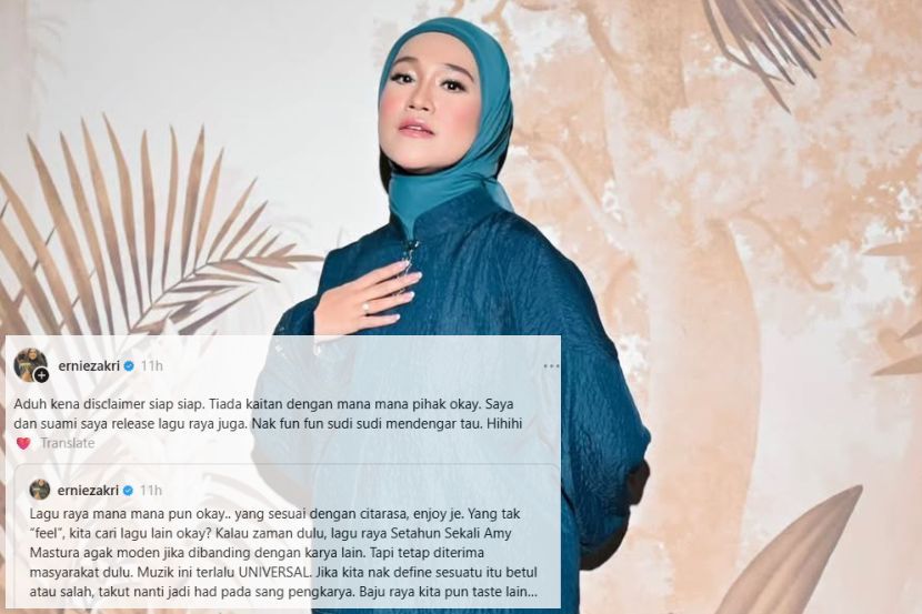 PENYANYI Ernie Zakri meminta orang ramai agar tidak menetapkan kriteria tertentu dalam penghasilan lagu raya yang kini semakin banyak dilancarkan.Bagi Ernie atau Nur Ernie Shahirah Zakri, 34, karya lagu bersifat sejagat dan setiap pendengar mempunyai pilihan tersendiri mengikut cita rasa masing-masing. "Muzik ini terlalu universal. Jika kita nak letakkan sesuatu itu betul atau salah, takut nanti jadi had kepada pengkarya.Perkongsian Ernie di Threads."Baju raya kita pun taste berbeza, apatah lagi muzik. Nikmati sahaja," katanya dalam satu hantaran di Threads.Tambahnya, kepelbagaian genre lagu raya juga membolehkan pendengar membuat pilihan sendiri tanpa perlu mencari kesalahan terhadap karya-karya yang tidak disukai.Malah, dia turut memberi contoh lagu berjudul Setahun Sekali nyanyian Amy Mastura yang masih mendapat sambutan baik sehingga hari ini.ARTIKEL BERKAITAN: Syamel dan Ernie Zakri terbang ke Hong Kong, teruja rakam muzik video Suasana Raya satu keluarga ARTIKEL BERKAITAN: Tiada syarat tetap lancarkan lagu raya, Syamel dan Ernie Zakri raikan setiap karya baharu"Lagu raya mana-mana pun okay, yang sesuai dengan cita rasa. Yang tak rasa kena, kita cari lagu lain."Kalau zaman dulu, lagu raya Setahun Sekali agak moden jika dibandingkan dengan karya lain, tetapi tetap diterima masyarakat," kongsinya.Syamel dan Ernie tampil dengan lagu berjudul Suasana Raya. Dalam masa sama, dia menegaskan hantaran tersebut tidak ditujukan kepada mana-mana pihak.Ernie turut berharap semua pendengar dapat menikmati semua karya termasuk lagu Suasana Raya nyanyiannya bersama suami, Syamel.Jadilah sebahagian daripada geng mStar! Follow kami di Telegram, Twitter, TikTok, Facebook, Instagram dan YouTube