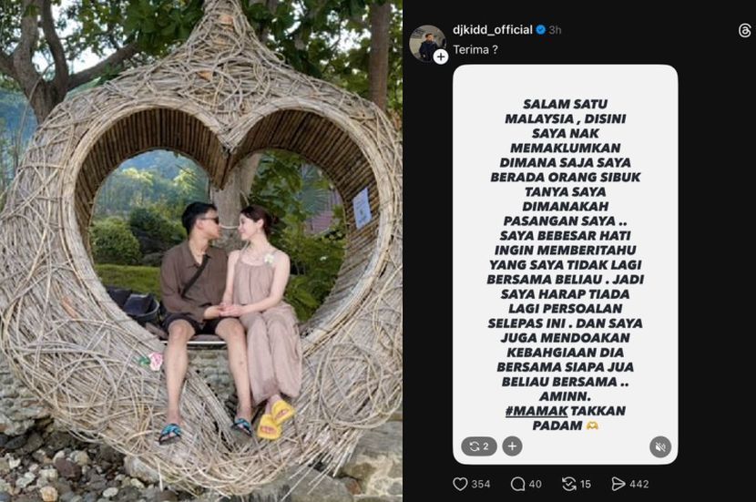 TIADA angin tiada ribut, deejay kelab malam yang pernah dikaitkan dengan pelakon Emma Maembong iaitu DJ Kidd mendedahkan dia kini tidak lagi bersama aktres berkenaan.DJ Kidd dalam satu kenyataan berkata, dia mengambil keputusan menjelaskan perkara itu susulan sering ditanya mengenai status hubungan mereka. Menurutnya, dia berharap penjelasan tersebut dapat menamatkan segala persoalan yang timbul.Hantaran DJ Kidd jadi perhatian netizen.“Salam satu Malaysia. Di sini saya nak memaklumkan, di mana saja saya berada, orang sibuk tanya saya, di manakah pasangan saya.“Saya berbesar hati ingin memberitahu yang saya tidak lagi bersama dia. Jadi saya harap tiada lagi persoalan selepas ini.“Dan saya juga mendoakan kebahagiaan dia bersama siapa jua dia bersama. Amin,” tulisnya menerusi satu hantaran di aplikasi Threads.ARTIKEL BERKAITAN: Tak perlu kabur muka, Emma Maembong mengaku pergi kelab malam… “Saya yang masuk dalam keadaan gembira”ARTIKEL BERKAITAN: Emma Maembong jaga privasi, tak selesa kongsi kisah cinta... Serah urusan jodoh pada takdirDalam perkongsian sama, dia turut meletakkan tanda pagar #mamaktakkanpadam yang dipercayai gabungan namanya dengan Emma.Meskipun tidak menyebut nama Emma secara langsung, rata-rata netizen percaya kenyataan itu merujuk kepada hubungan tersebut.Perkongsian berkenaan turut meraih perhatian ramai apabila sebahagian netizen tampil memberi kata-kata semangat kepada DJ Kidd.Sebelum ini, menerusi temu bual bersama mStar, Emma atau nama sebenarnya Fatimah Rohani Ismail, 33, mengakui dia sedang berkawan rapat dengan DJ Kidd.Hubungan pasangan ini mula menjadi perhatian netizen sejak setahun lalu.