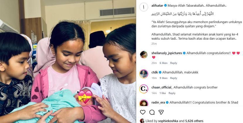 PENYANYI dan pelakon Alif Satar berkongsi khabar gembira apabila isterinya selamat melahirkan cahaya mata keempat mereka pada 2 Syawal. Khabar gembira itu dikongsikan sendiri oleh Alif atau Muhammd Alif Mohd Satar, 36, menerusi sebuah hantaran di Instagram miliknya pada Ahad. "Masya-Allah Tabarakallah. Alhamdulillah, Shad selamat melahirkan anak kami yang ke-4 waktu subuh tadi. Alif dan isteri dihujani dengan ucapan tahniah."Terima kasih atas doa dan ucapan kalian," katanya.Menerusi hantaran tersebut turut memaparkan anak sulungnya memangku bayi berkenaan sambil ditemani dua adiknya.Bagaimanapun, Alif menutupi wajah anaknya dengan emoji hati selain masih merahsiakan nama pilihan dia dan isteri.ARTIKEL BERKAITAN: Alif Satar kagum semangat isteri, berjaya tamatkan larian 10km walaupun hamil empat bulanARTIKEL BERKAITAN: Alif Satar tersentuh lihat ‘keffiyeh’ Palestin jadi simbol solidariti di EropahDia juga tidak berkongsi secara terperinci jantina bayi yang baru dilahirkan. Dalam pada itu, Alif turut menitipkan doa baut anaknya yang baru lahir itu agar sentiasa berada dalam lindungan Allah SWT.Alif dan keluarga sempat beraya pada Syawal pertama.“Ya Allah! Sesungguhnya aku memohon perlindungan untuknya dan zuriatnya daripada syaitan yang direjam," ujarnya.Untuk rekod, Alif dan Shadila Halid mendirikan rumah tangga pada 15 September 2014.Hasil perkongsian hidup, mereka dikurniakan tiga orang cahaya mata iaitu Alisha Anugerah, 11, Ariana Mecca, 9, dan Muhammad Ali yang kini berusia 7 tahun. Jadilah sebahagian daripada geng mStar! Follow kami di Telegram, Twitter, TikTok, Facebook, Instagram dan YouTube