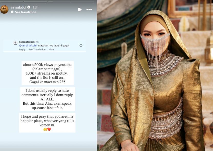 PENYANYI Aina Abdul tidak berdiam diri apabila lagu rayanya dilabelkan sebagai 'gagal' oleh segelintir netizen.Aina atau Nurul Aina Abdul Ghani, 31, berkata dia terpanggil untuk mempertahankan hasil kerjanya kerana tuduhan tersebut disifatkan sebagai keterlaluan. Kata Aina, pencapaian lagu berkenaan hampir 500,000 tontonan di saluran YouTube membuktikan ia bukan seperti didakwa netizen.Aina bersuara pertahankan karyanya.“Hampir 500,000 tontonan di YouTube dalam seminggu, lebih 100,000 penstriman di Spotify dan senarai itu masih berterusan.“Gagal ke macam ni?” katanya dalam satu hantaran di Instastory.Dalam hantaran tersebut, Aina turut berkongsi tangkap layar komen negatif yang diterimanya.ARTIKEL BERKAITAN: Berbelit lidah Aina Abdul nyanyi lagu raya irama Timur Tengah, peminat tak sabar nak bergelek pagi Syawal... “Dah terbayang berjoget sambil pegang jug air”ARTIKEL BERKAITAN: Keluarga dapat duit ‘shopping’ sebelum bercuti, ramai puji sikap murah hati Aina AbdulBagaimanapun, Aina tidak menjelaskan karya mana yang menerima kritikan memandangkan tahun ini dia mengeluarkan dua lagu raya namun dipercayai Ya Habibi Ya Aidilfitri.Tambah Aina, dia bukan jenis yang gemar membalas komen kebencian, malah kebiasaannya memilih untuk berdiam diri.“Saya biasanya tak balas komen ‘hate’. Sebenarnya memang tak balas langsung.Aina jarang balas sekiranya terima komen negatif.“Tapi kali ini, saya akan bersuara sebab ia tak adil,” ujarnya tegas.Dalam pada itu, Aina turut mendoakan agar individu yang meninggalkan komen negatif itu sentiasa berada dalam keadaan lebih baik.“Saya harap dan doakan awak berada di tempat yang lebih bahagia, siapa pun yang tulis komen ini,” katanya.