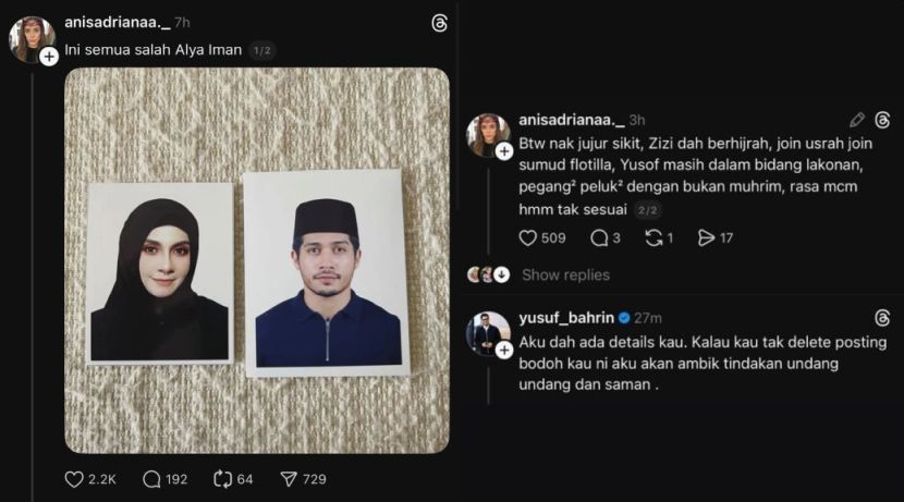 BENGANG dengan tuduhan tidak berasas netizen, pelakon Yusuf Bahrin memberi amaran kepada seorang individu yang menjaja kisah rumah tangganya bersama penyanyi Zizi Kirana berakhir dengan perceraian disebabkan aktres Alya Iman. Yusuf atau Muhammad Yusuf Bahrin, 34, berkata dia tidak teragak-agak untuk mengambil tindakan undang-undang bagi memberi pengajaran kepada individu berkenaan. "Aku dah ada maklumat peribadi kau. Kalau kau tak padam hantaran bodoh kau, aku akan ambil tindakan undang-undang dan saman," katanya ringkas membalas komen netizen di Threads.Yusuf bertegas mahu ambil tindakan undang-undang.Terdahulu seorang dikenali sebagai @anisadrianaa._ mendakwa Alya Iman menjadi punca keretakan hubungan suami isteri selain menuduh pasangan itu tidak sekufu memandangkan Zizi berjihad ke jalan Allah manakala Yusuf masih tidak menjaga batas dalam bidang lakonan."Nak jujur sikit, Zizi dah berhijrah, sertai usrah dan Sumud Flotilla."Yusuf masih dalam bidang lakonan. Pegang dan peluk-peluk dengan bukan muhrim. Rasa macam tak sesuai," ujarnya.ARTIKEL BERKAITAN: Sudah cuba selamatkan…Yusuf Bahrin, Zizi Kirana pilih berpisah secara baikARTIKEL BERKAITAN: Yusuf Bahrin, Zizi Kirana sah cerai talak satuBagaimanapun individu berkenaan bertindak memadam posting tersebut beberapa jam kemudian.Sementara itu, pihak pengurusan Alya Iman iaitu Stars Powerhouse Entertainment tampil menyangkal dakwaan yang mengaitkan artis mereka dengan isu penceraian pasangan berkenaan.Mereka juga menganggap tuduhan tersebut bertujuan untuk menjejaskan nama baik Alya Iman dan tidak teragak-agak untuk mengambil tindakan undang-undang terhadap mereka yang menyebarkannya."Stars Powerhouse Entertainment memandang serius penyebaran kenyataan palsu yang mengaitkan artis kami, Alya Iman, dengan isu perceraian pasangan artis yang tular baru-baru ini. Tuduhan ini adalah tidak benar, berunsur fitnah dan menjejaskan reputasi.Zizi dan Yusuf sah bercerai talak satu."Kami tidak akan berkompromi dan akan mengambil tindakan undang-undang terhadap mana-mana pihak yang terlibat. Hentikan penyebaran serta-merta dan turunkan semua," kongsinya di Instagram.Pada pagi Khamis, Yusuf dan Zizi atau nama sebenarnya Nur Fazelah Mad Tahil, 41, sah bercerai talak satu di Mahkamah Rendah Syariah Petaling, Selangor pada Khamis.Untuk rekod, Yusuf dan Zizi mendirikan rumah tangga pada 19 September 2021 dan belum dikurniakan cahaya mata.Jadilah sebahagian daripada geng mStar! Follow kami di Telegram, Twitter, TikTok, Facebook, Instagram dan YouTube