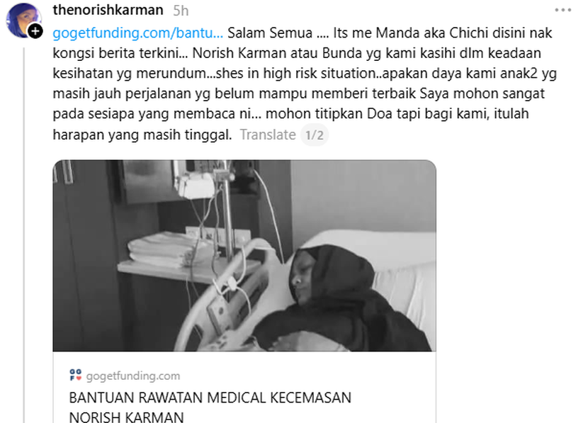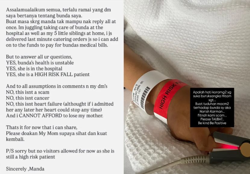 ANAK kepada pelakon, Norish Karman iaitu Manda tampil menjelaskan salah faham orang ramai berhubung keadaan kesihatan ibunya yang kini sedang menerima rawatan di hospital.Menurut Manda, dia menerima terlalu banyak mesej peribadi (DM) daripada orang ramai yang ingin mengetahui perkembangan terkini ibunya, namun tidak mampu membalas satu persatu kerana komitmen yang perlu dipikul ketika ini. “Buat masa sekarang, saya tak mampu nak balas semua mesej. Saya sedang menguruskan bunda di hospital, dalam masa yang sama menjaga lima adik kecil di rumah.Manda kongsi keadaan ibunya.“Saya juga baru sahaja menyiapkan tempahan katering saat akhir untuk menambah dana bagi membayar bil perubatan bunda,” katanya dalam hantaran di Instagram.Menerusi hantaran tersebut dia juga menjawab beberapa persoalan yang sering diajukan netizen bagi mengelakkan kekeliruan berterusan.Jelasnya, keadaan kesihatan ibunya masih belum stabil dan sedang menerima rawatan rapi di hospital.ARTIKEL BERKAITAN: Norish Karman berdepan penyakit kritikal, rayu sumbangan untuk rawatan segeraARTIKEL BERKAITAN: Norish Karman seronok jadi pensyarah, tunggu tawaran lakonan tak perlu buka tudung“Ya, keadaan kesihatan bunda tidak stabil. Ya, dia sedang dirawat di hospital. Ya, dia merupakan pesakit berisiko tinggi untuk jatuh (high risk fall),” jelasnya.Dalam masa sama, dia turut menafikan beberapa dakwaan yang tular di media sosial mengenai penyakit yang dialami ibunya.“Tidak, ini bukan scam. Tidak, ini bukan kanser. Tidak, ini bukan kegagalan jantung, walaupun jika saya lambat bawa ke hospital, jantungnya boleh berhenti bila-bila masa,” katanya lagi. Fitnah kami scam, tolong taubat!MANDAANAK Tambahnya, dia amat berharap orang ramai terus mendoakan kesihatan ibunya agar kembali pulih seperti sediakala.Malah memaklumkan tiada pelawat dibenarkan buat masa ini kerana keadaan ibunya masih berisiko tinggi.“Saya tak sanggup kehilangan ibu saya. Setakat ini sahaja yang saya mampu kongsikan. Mohon doakan agar bunda saya kembali sihat dan kuat,” ujarnya.Sementara itu, dalam hantaran lain, Manda berkongsi foto tangan dipercayai milik aktres berkenaan memakai gelang bertulis 'high risk fall'.Manda sebelum ini meminta sumbangan orang ramai buat ibunya."Apalah hati korang yang suka buruk sangka, hitam sangat. Buat tuduhan macam-macam terhadap bunda saya. Fitnah kami scam, tolong taubat!” luahnya.Sebelum ini, Manda menerusi akuan media sosial ibunya memaklumkan kesihatan aktres tersebut semakin merosot dan berisiko diserang angin ahmar gara-gara masalah anemia atau kekurangan sel darah merah.Katanya, Norish, 52, memberitahu dia berkemungkinan memerlukan rawatan pemindahan darah bagi merawat penyakit berkenaan.Jadilah sebahagian daripada geng mStar! Follow kami di Telegram, Twitter, TikTok, Facebook, Instagram dan YouTube