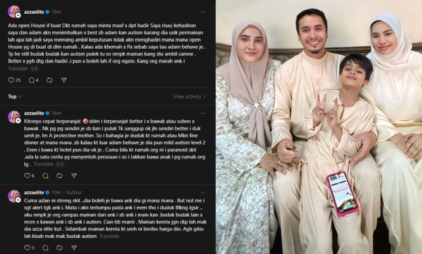 PENYANYI Azza Zawari memilih untuk menolak jemputan rumah terbuka hari raya kerana bimbang anaknya iaitu Adam menimbulkan rasa kurang selesa terhadap tuan rumah dan tetamu.Menurut Azza atau nama sebenarnya Nor Azzarima Zawari, 49, anak lelakinya yang kini berusia lapan tahun memerlukan lebih perhatian selepas didiagnosis autisme ringan tahap dua. Katanya, keputusan itu dibuat demi menjaga sensitiviti semua pihak selain mengelakkan sebarang situasi yang tidak diingini berlaku.Azza tak mahu kejadian tak diingini berulang lagi."Ada rumah terbuka kalau buat di rumah saya minta maaf tak hadir, saya risau kehadiran saya dan Adam akan timbulkan rasa tak best sebab Adam autism."Karang dia usik pemainan apalah, jadi saya memang ambil keputusan tidak hadir mana-mana rumah terbuka yang dibuat di dalam rumah. Kalau ada khemah tak apa sebab saya tahu Adam behave."Tapi dia masih budak autisme, jadi nampak mainan kang dia ambil macam mana, baik tak payah datang. Saya pun tak boleh kalau orang mengata dan marah anak saya," katanya menerusi hantaran Thread.ARTIKEL BERKAITAN: Tak ‘hamak’ nak makan percuma, Azza Elite ada cara sendiri bantu peniagaARTIKEL BERKAITAN: Pekerja ‘songlap’ duit jual kek, Azza Elite kesal layanan baik dibalas mencuriJelasnya, keputusan itu diambil selepas anaknya terlibat dalam satu kejadian yang menyentuh hati malah menyedari tidak ramai yang memahami keadaan anak istimewanya.Cerita Azza lagi, hatinya pernah tersentuh apabila kanak-kanak sebaya enggan bermain dengan Adam selain mainan di tangan turut dirampas di depan matanya."Saya nampak saja orang rampas mainan dari anak saya sebab Adam tengah main. Budak-budak lain tak nak kawan dengan anak saya sebab dia autism. Saya bahagia saja duduk di rumah.AZZA ELITEPENYANYI"Kasihan anak saya, mainan kereta jangan cakaplah mak dia Azza Elite kut selambak dekat rumah ini," luahnya.Sebagai ibu, Azza berkata dia rela duduk di rumah bersama anaknya kerana merasakan itu tempat terbaik buat anaknya.Namun dia tetap membawa Adam ke tempat-tempat tertentu yang dirasakan sesuai, seperti hotel atau lokasi yang lebih terkawal.Azza mahu lindungi anaknya."Kitanya cepat terperanjat, sebelum saya terperanjat lebih baik saya atau suami tak bawa. Nak pergi sendiri saja tapi saya pula tak sanggup, baik duduk rumah."Saya pula ibu yang melindungi, jadi saya bahagia saja duduk di rumah atau makan fine dinner dekat mana-mana. "Sebab kalau dekat luar Adam behave saja walaupun saya bawa dia ke hotel. Cuma bila dekat rumah orang ini saya paranoid sikit," luahnya.Jadilah sebahagian daripada geng mStar! Follow kami di Telegram, Twitter, TikTok, Facebook, Instagram dan YouTube